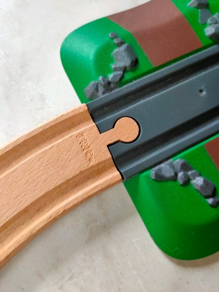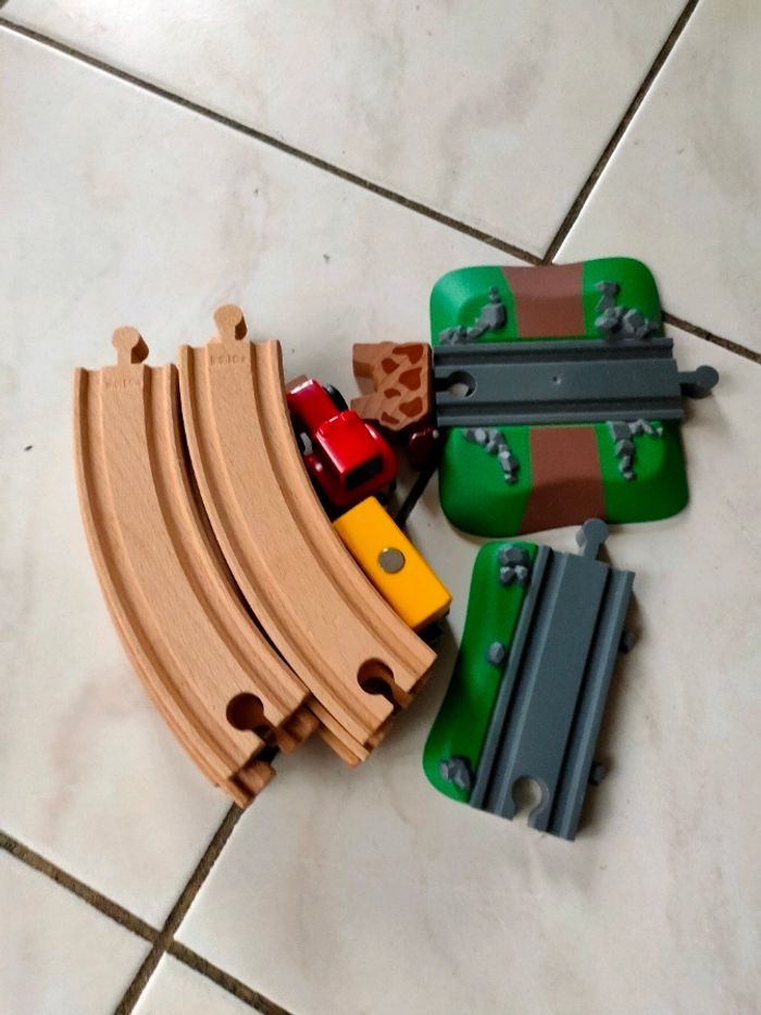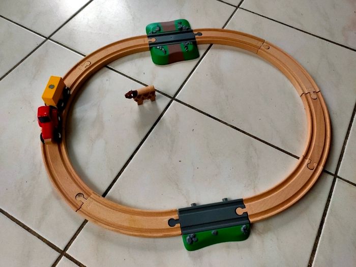 Petit train en bois 1ere âge, marque Brio, un rail n'est pas de la marque mais est compatible. L'ensemble est en très bon état.