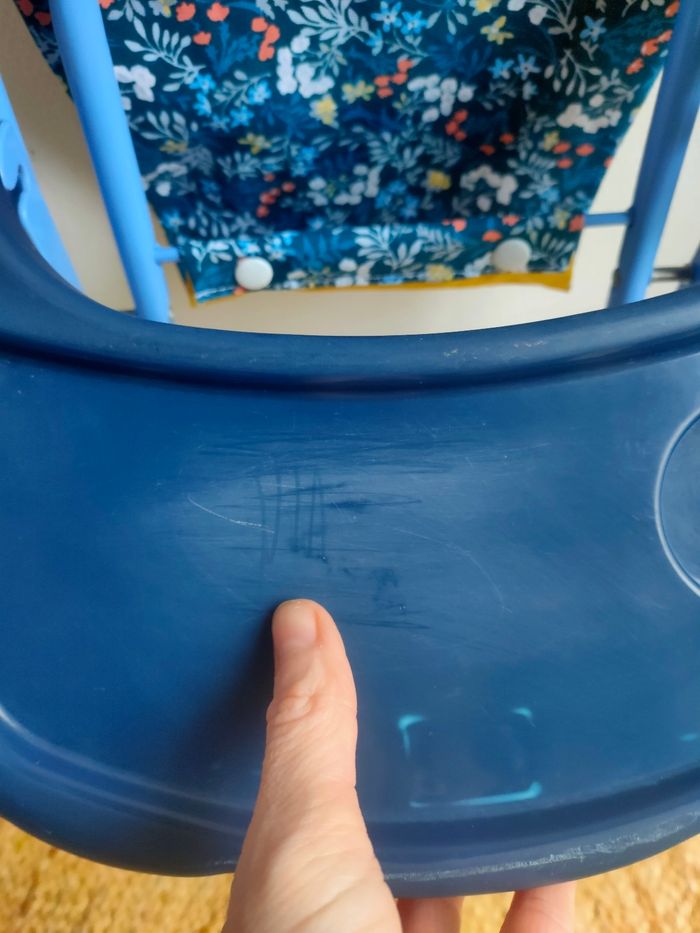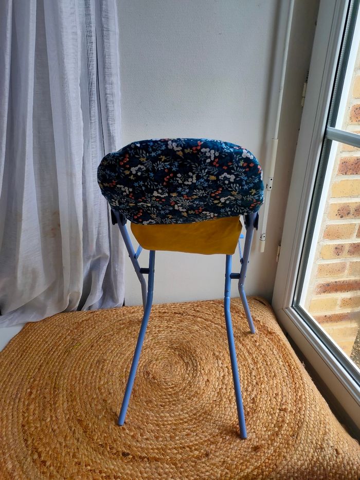 Chaise Haute pour poupée, coloris bleu motifs petites fleurs. Elles est pliable ce qui est un gros avantage pour le rangement car prends peux de place. La structure de la chaise est d'occasion et a été pas mal manipuler, le plateau a des rayures. Le tissu de l'assise est neuf et a été fait mains. Le tissu est déhoussable et passe en machine. Cette petite chaise haute est unique.