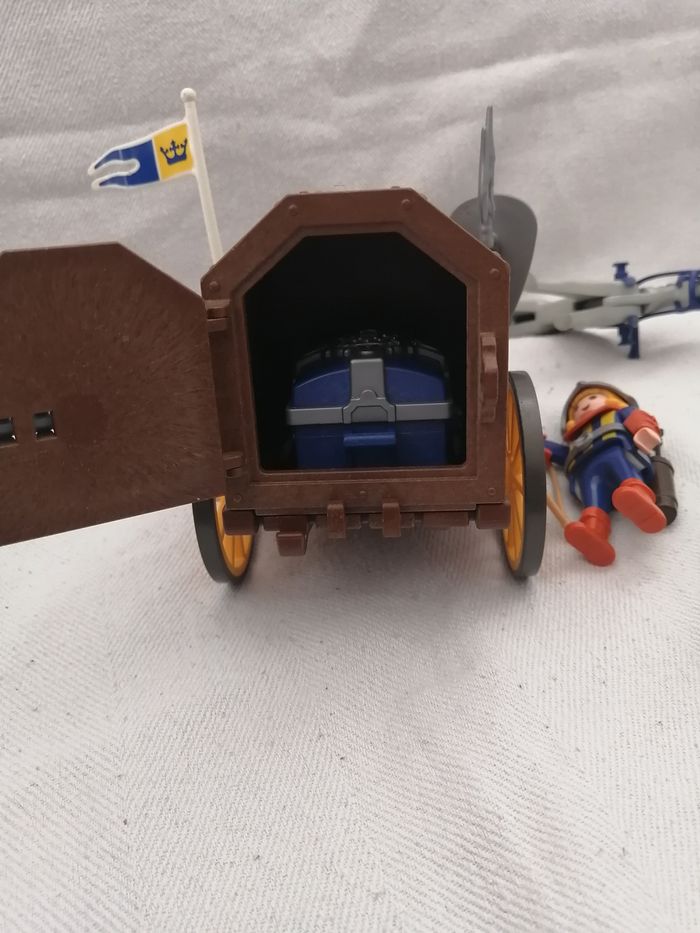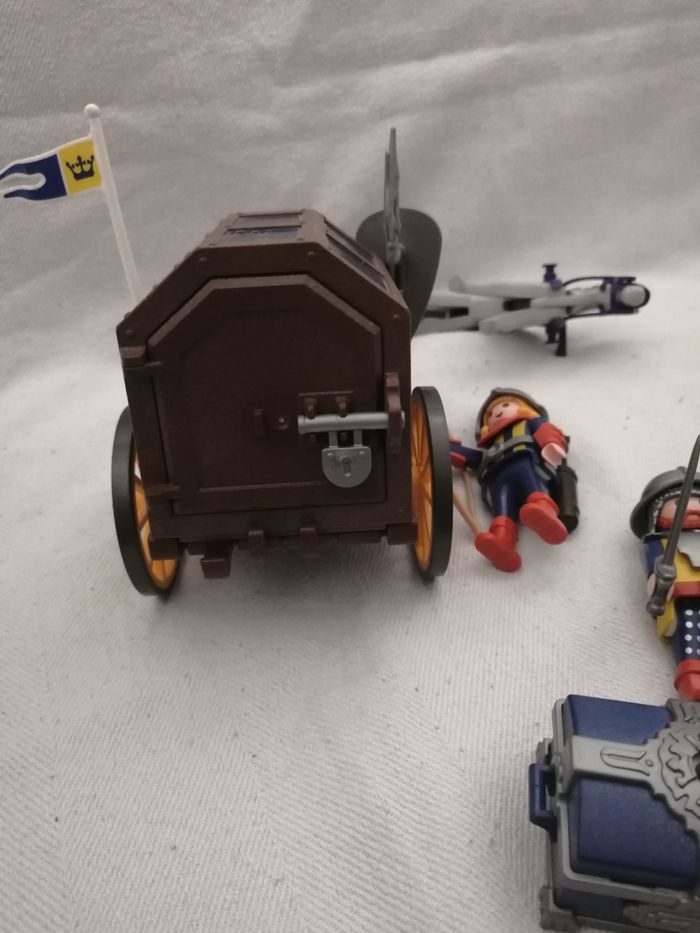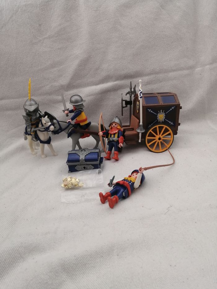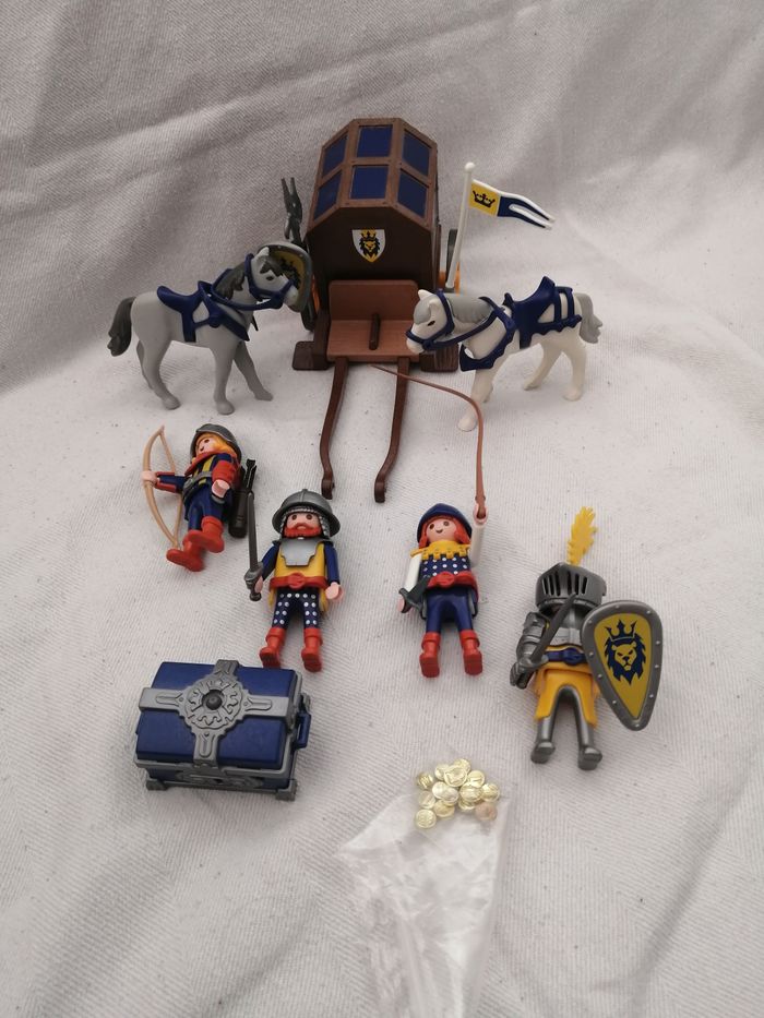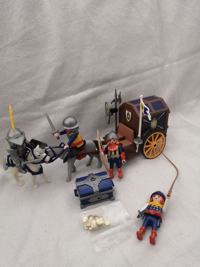 convoi royal playmobil n° 3314 charrette , 4 personnages ,2 chevaux + accessoires la fermeture du coffre n'est plus fonctionnelle vendu comme sur les photos peut présenter quelques traces du jeux