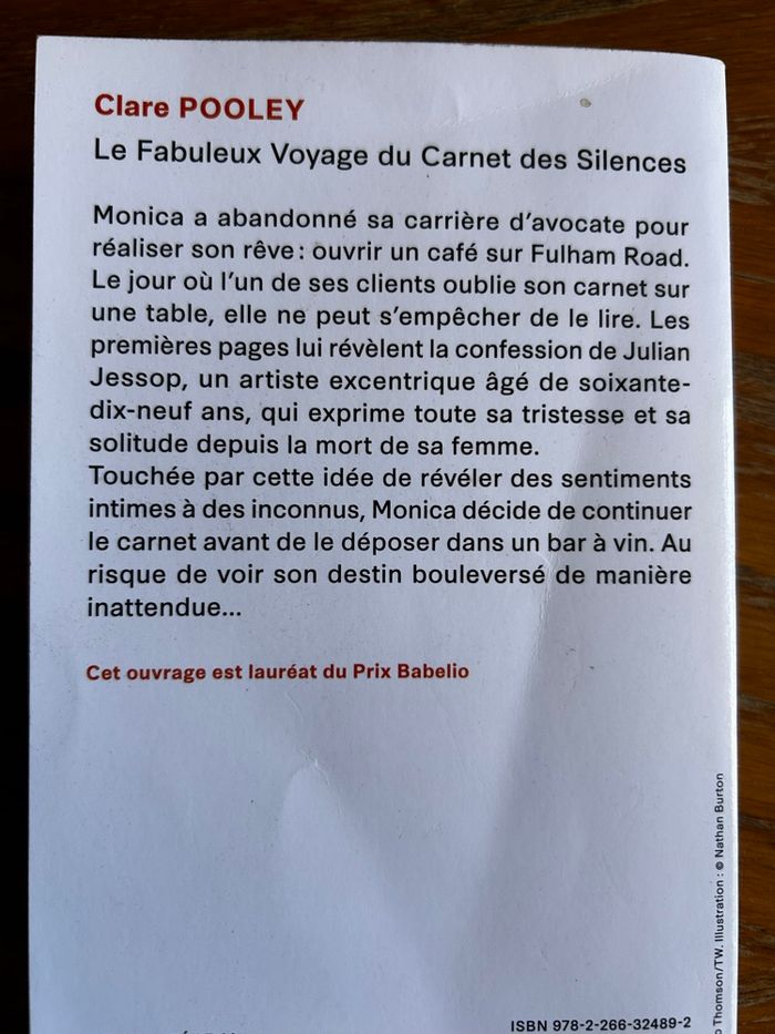 Livre de poche du roman « le fabuleux voyage du carnet des silences » de Clare Pooley chez Babelio éditions Pocket. Résumé sur 3ième photo. 504 pages. Bon état