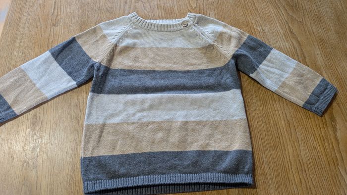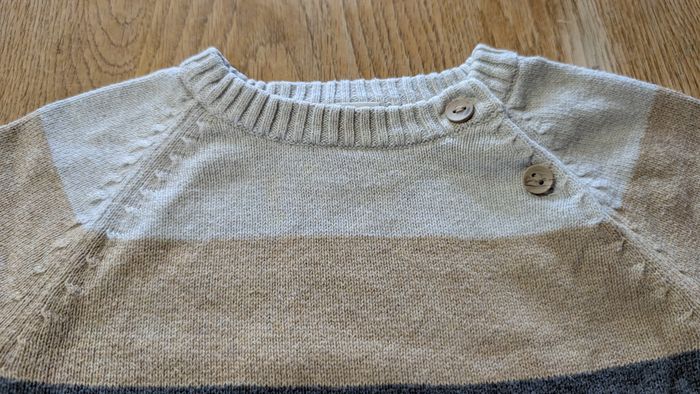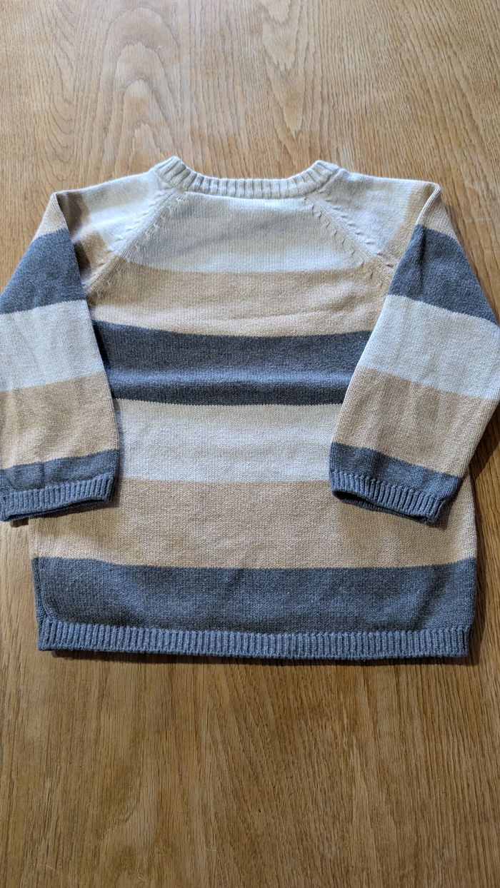 Pull garçon rayé de couleur gris / beige Petit bouton à l'encolure pour faciliter le passage à la tête 9-12 mois / 74cm