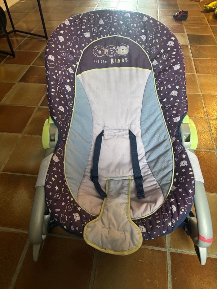 Transat bébé bon état général, à 2 cran pour le dossier, se balance d'avant en arrière et de droite à gauche