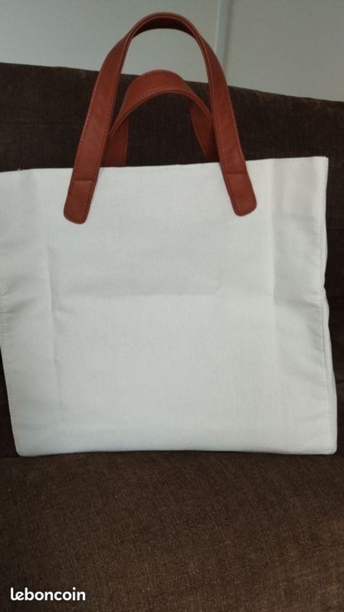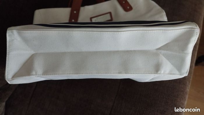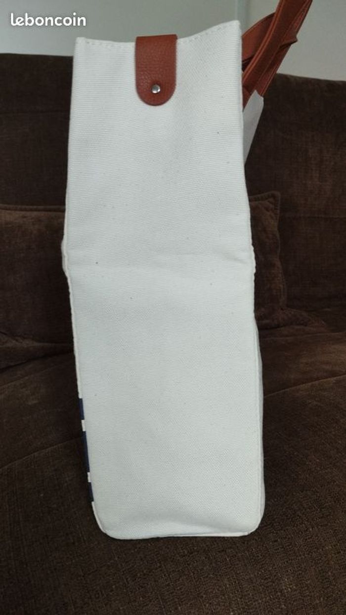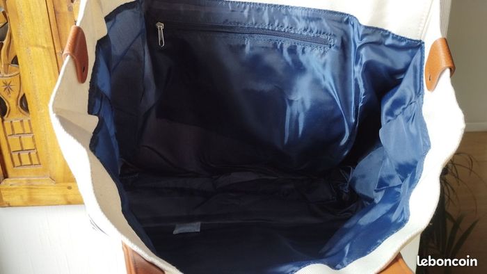 Sac en toile de coton épais . Multifonction pour shopping, courses, sport, week-end ! 1 poche intérieure zippée pour clés, téléphone...Coloris écru avec rayures Bleue marine. Longueur 38cm Hauteur 34cm Profondeur 12cm. NEUF jamais utilisé.
