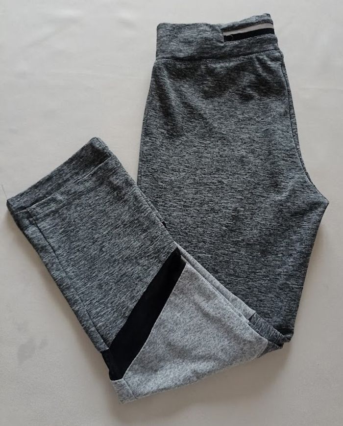 Superbe legging de sport court (coupe corsaire/capri), idéal pour vos séances de fitness, running ou yoga. Ce modèle présente un design épuré avec un dégradé de gris chiné et des empiècements géométriques gris clair, complété par une bande en mesh (résille) noire très tendance sur le bas de la jambe. Détails pratiques : Il possède une petite poche zippée discrète à l'arrière de la taille, parfaite pour ranger vos clés ou votre monnaie en toute sécurité pendant l'effort. (Voir photos pour plus de détails). Confort & Composition : Tissu technique élastique et agréable à porter. 92% Polyester, 8% Élasthanne. Entretien : Lavage à 30°C. N'hésitez pas si vous avez des questions ou si vous souhaitez d'autres photos.