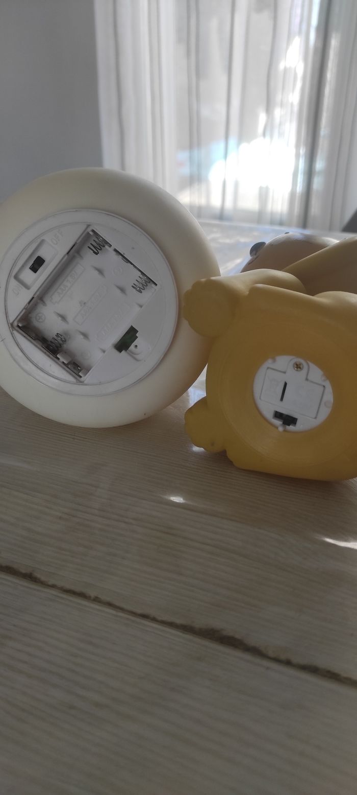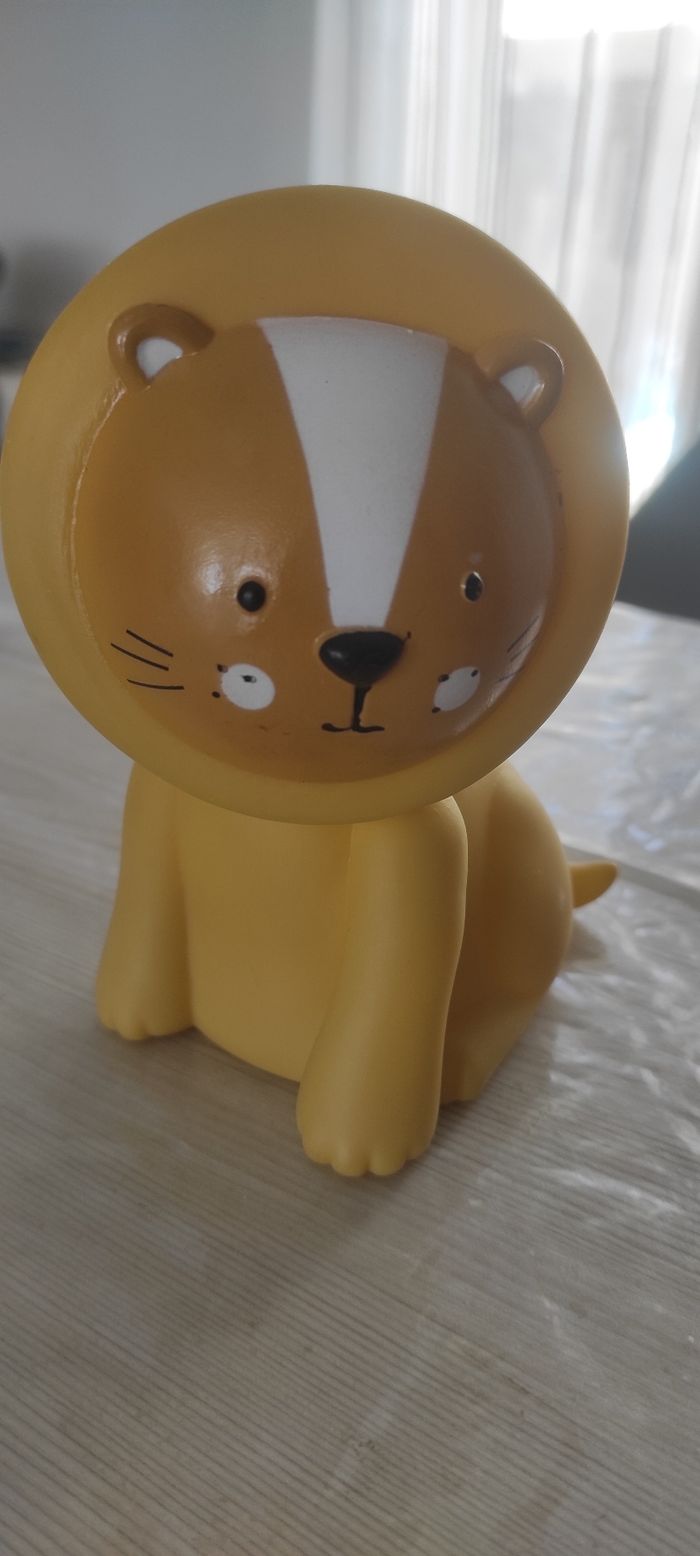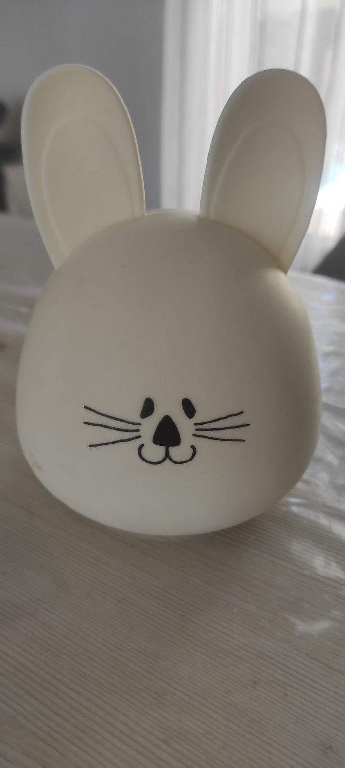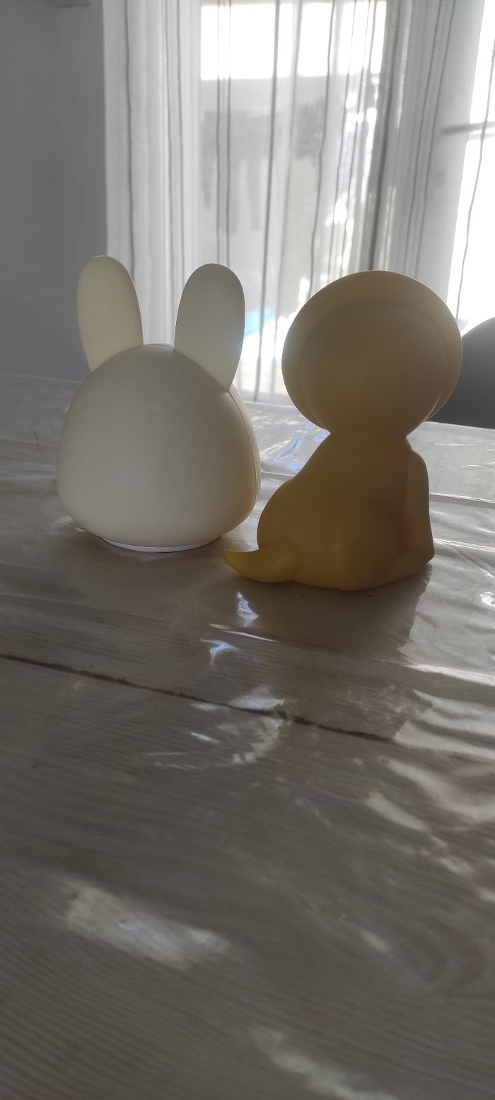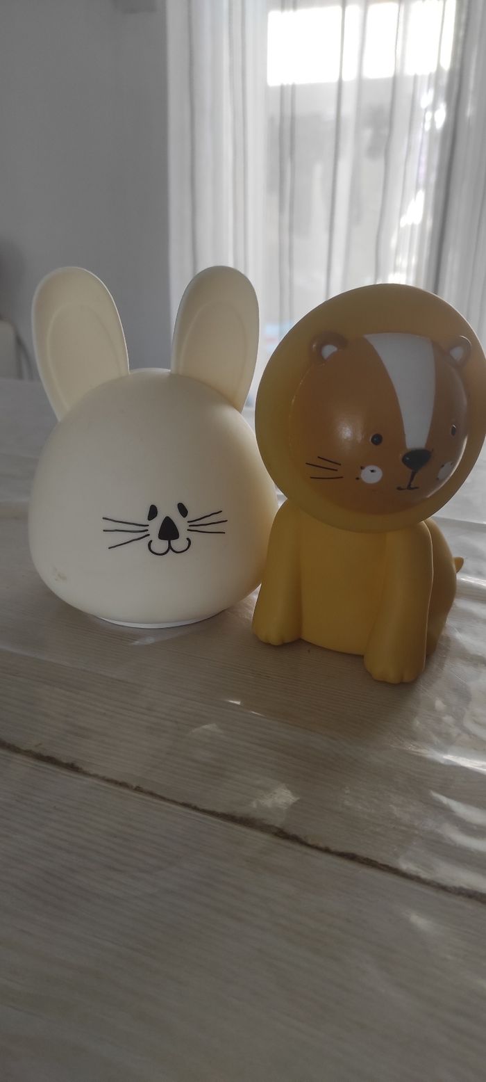 Lot de 2 veilleuses Une lapin blanc Une lion jaune Fonctionnent chacune avec piles La lion s'allume avec un bouton La lapin s'allume en touchant le lapin (tactile sur toute la tête du lapin) Chacune en bon état (manque le cache pile du lapin )