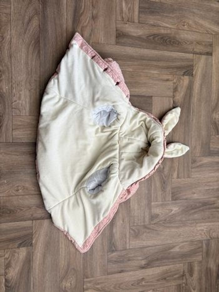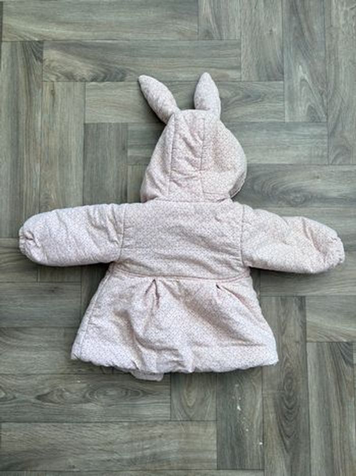 Veste bien chaude en bon état général (état comme sur les photos), elle a servi tout cet hiver et un bouton a été changée (voir 4ème photo) Sur la dernière photo vous pouvez voir qu’il y a écrit « 10 » sur l’étiquette mais je ne sais pas à quoi ça correspond puisque ma fille l’a porté à 3 ans Oreilles de lapin sur la capuche et couleur comme sur la 4ème photo Du bout de la manche gauche à l’autre bout de la manche droit (avec donc le dos au milieu) il y a 70cm, pour la taille on a 32cm et la longueur on a 35cm (sans la capuche bien sûr)