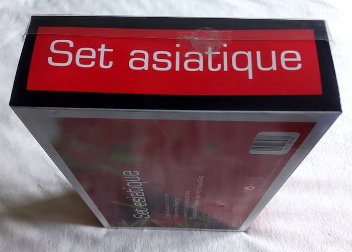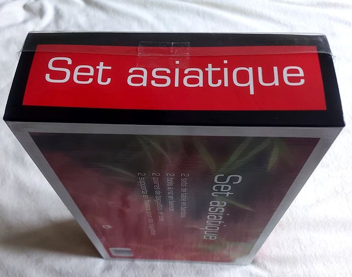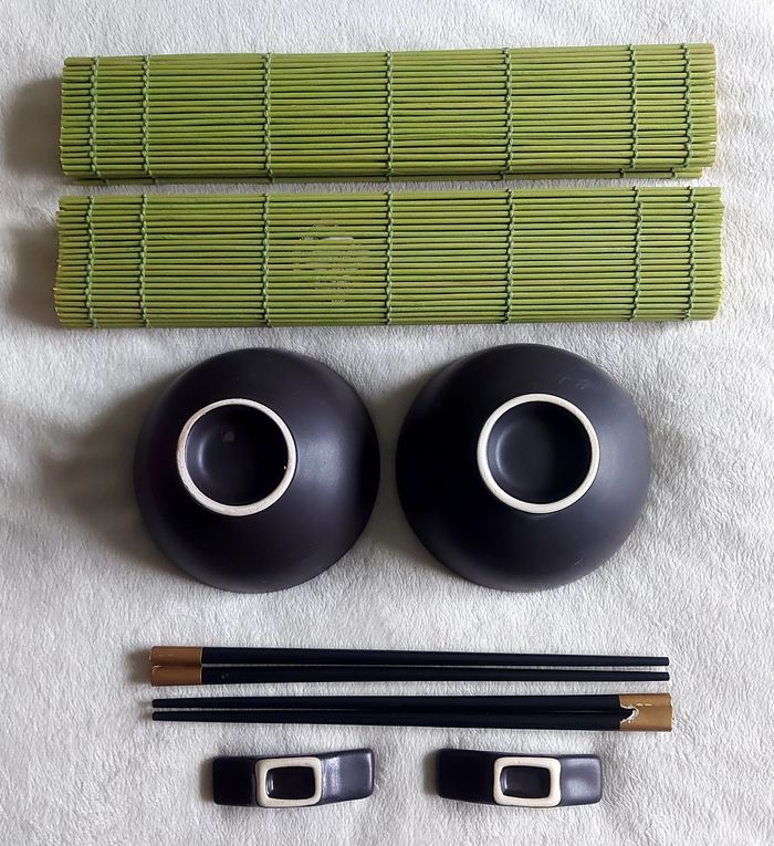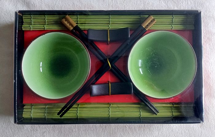 Je vends ce service de vaisselle asiatique vert et noir. - Type de produit : Service de vaisselle - Matière : Céramique et bambou - Couleur : Vert et noir - Accessoires inclus : 2 bols et 2 reposes baguettes en céramique, 2 paires de baguettes et 2 sets de table en bambou. État neuf, jamais servi dans sa boîte d'origine. Remise en main propre possible.