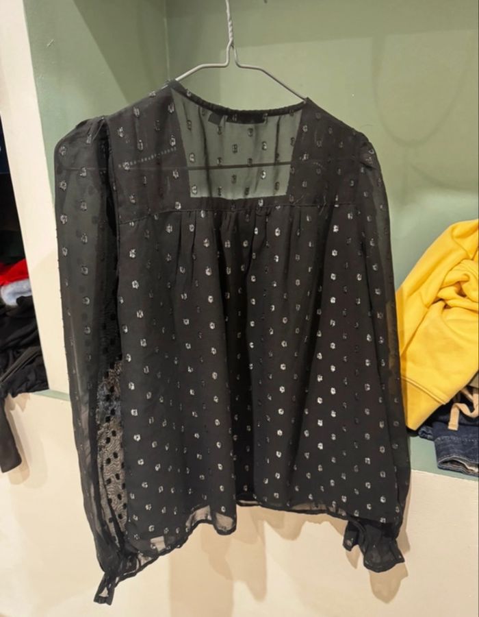 Joli haut noir à pois argenté avec un col en V de couleur bleu marine. Manche longue légèrement transparente avec poignets élastique volante. Doublure opaque sur le corps