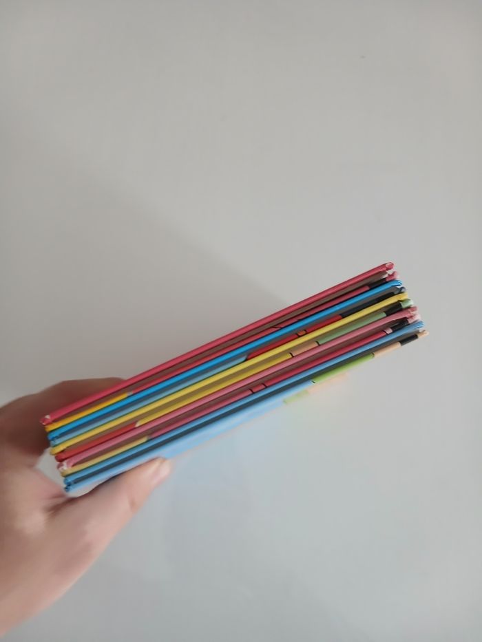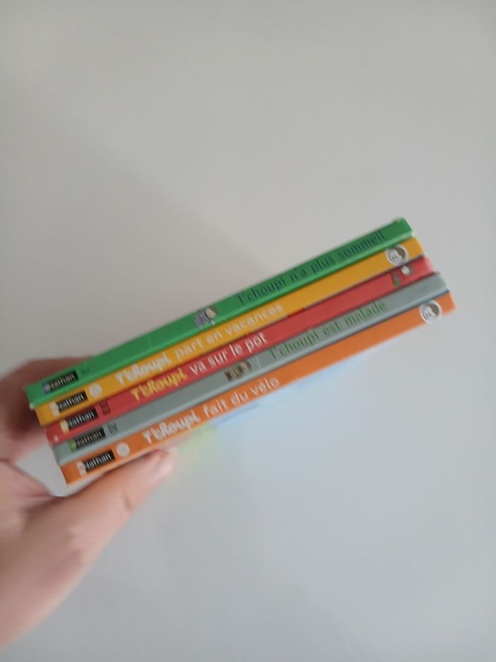 Je vends un lot de 5 albums de la célèbre collection "T'choupi, l'ami des petits". Idéal pour accompagner les jeunes enfants dans leurs premières découvertes et les étapes de la vie quotidienne. ​Liste des titres inclus : ​T'choupi va sur le pot ​T'choupi n'a plus sommeil ​T'choupi part en vacances (version avec icône audio) ​T'choupi est malade ​T'choupi fait du vélo (version avec icône audio) ​État du lot : ​Bon état général : Les couvertures et les tranches sont bien conservées (voir photos). ​Intérieurs propres, coins légèrement frottés par endroits mais l'ensemble reste solide et très présentable. ​Éditions Nathan, format cartonné robuste.