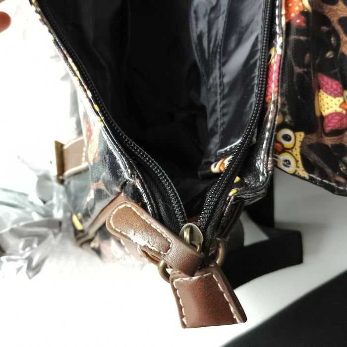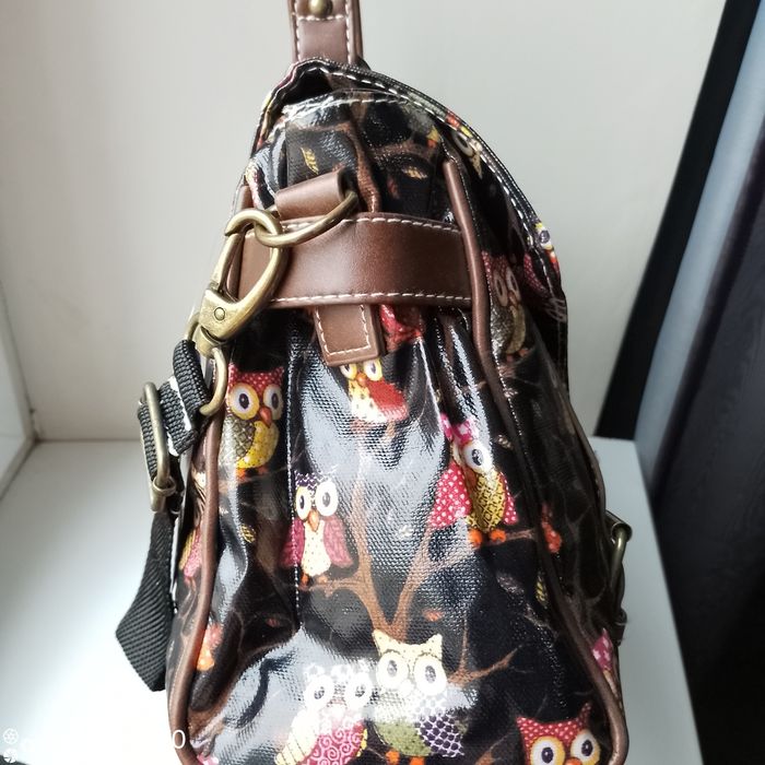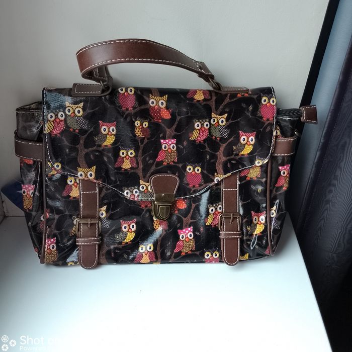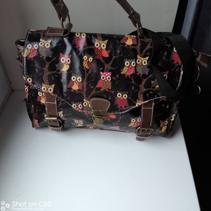 Vend un petit sac à main . Longueur 33cm par 20cm et la profondeur est de 10cm . Hiboux imprimés sur matière enduit . 1 poche zippée à l'intérieur et 2 petits pour tel ou autres. . Fermeture uniquement sur le devant.les bretelles sont juste factices . Lanière incluse