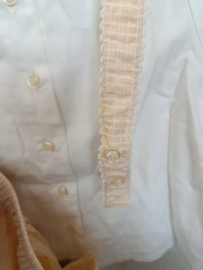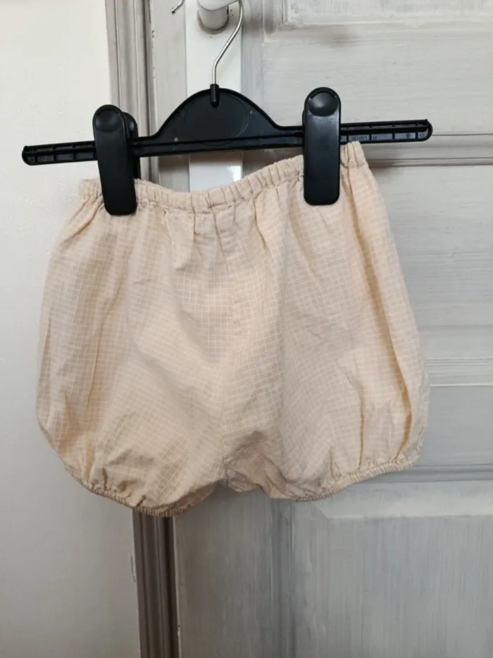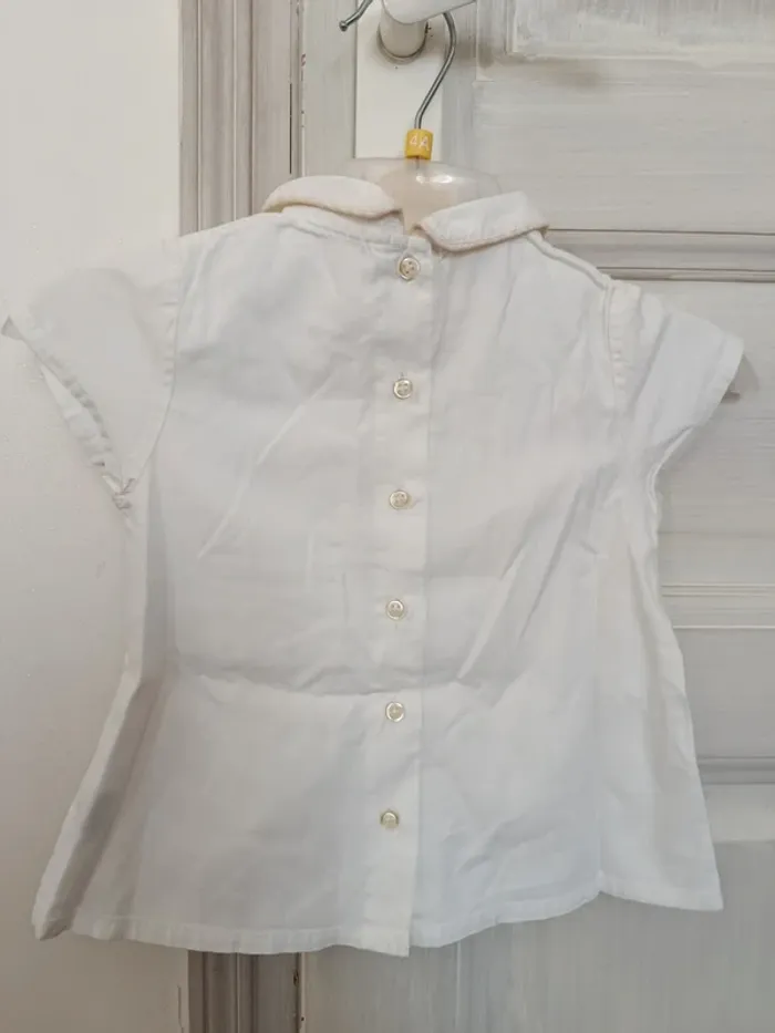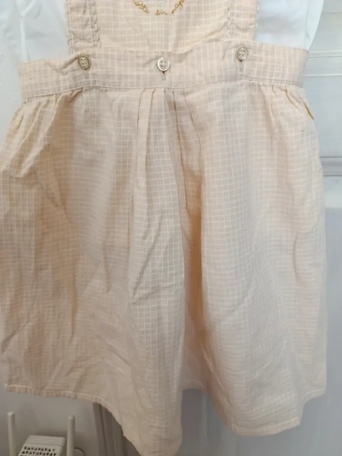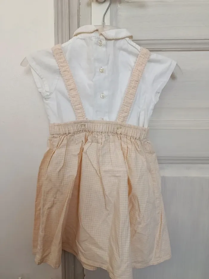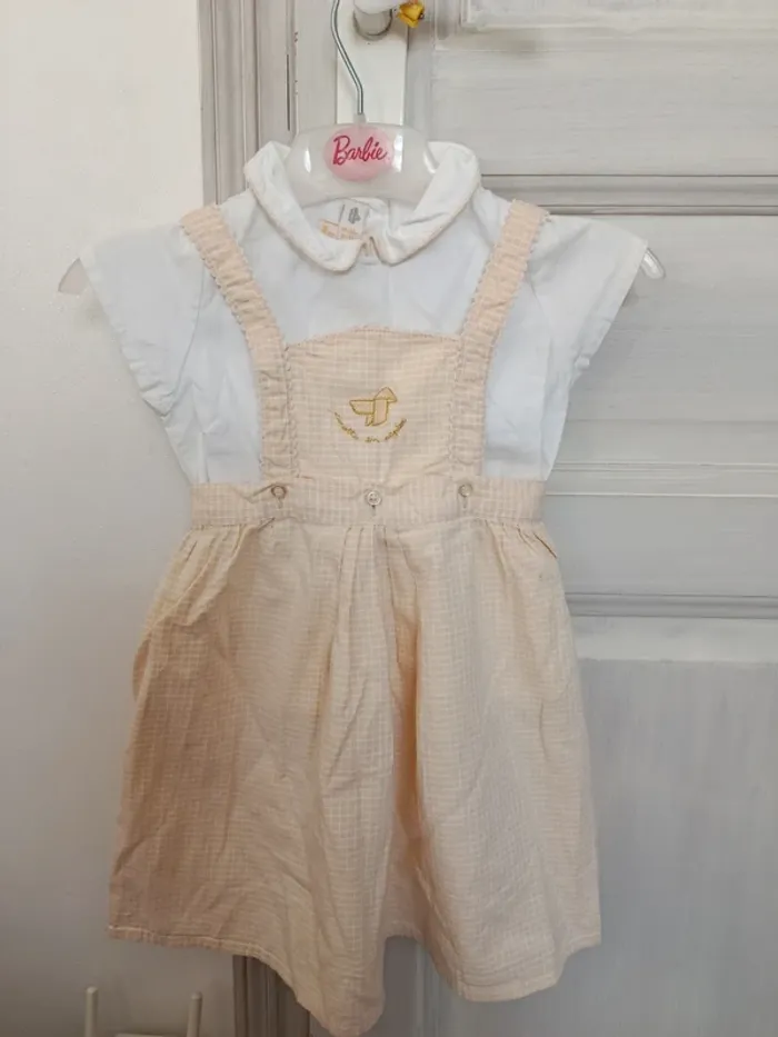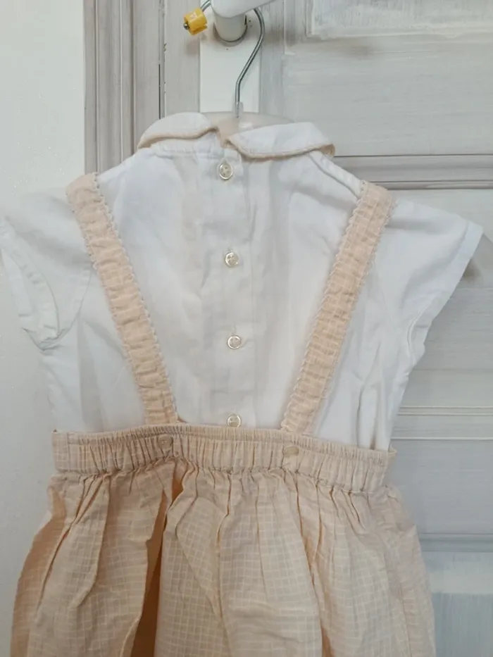 Ensemble bébé fille composé : 1 chemise manches courtes boutons dans le dos. 1 shorty taille élastique. 1 robe salopette boutons sur le devant et à l'arrière. Les bretelles sont réglables. 12 mois