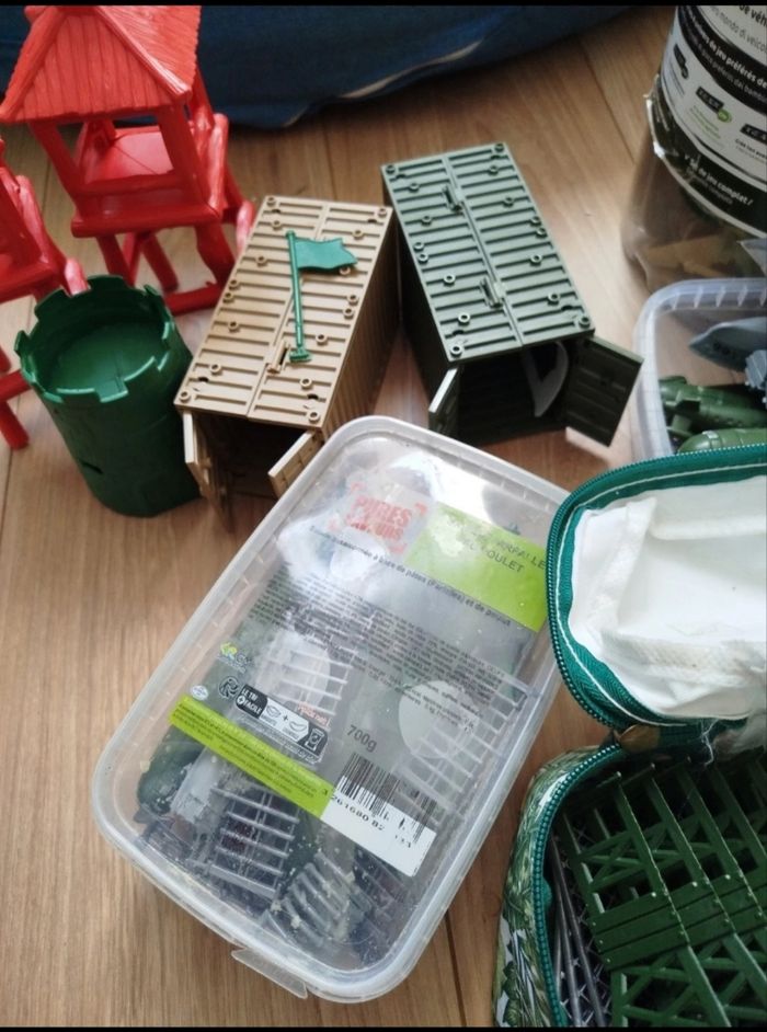 Gros lot de petits bonjour vert en bon état général certaines pièce on du vécu. Il y a des containers, soldats, barrière, barbelés, ect.. Prix négociable dans la limite du raisonnable