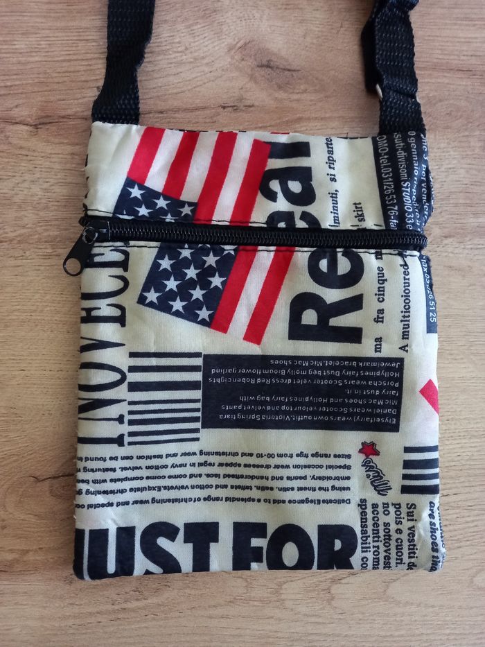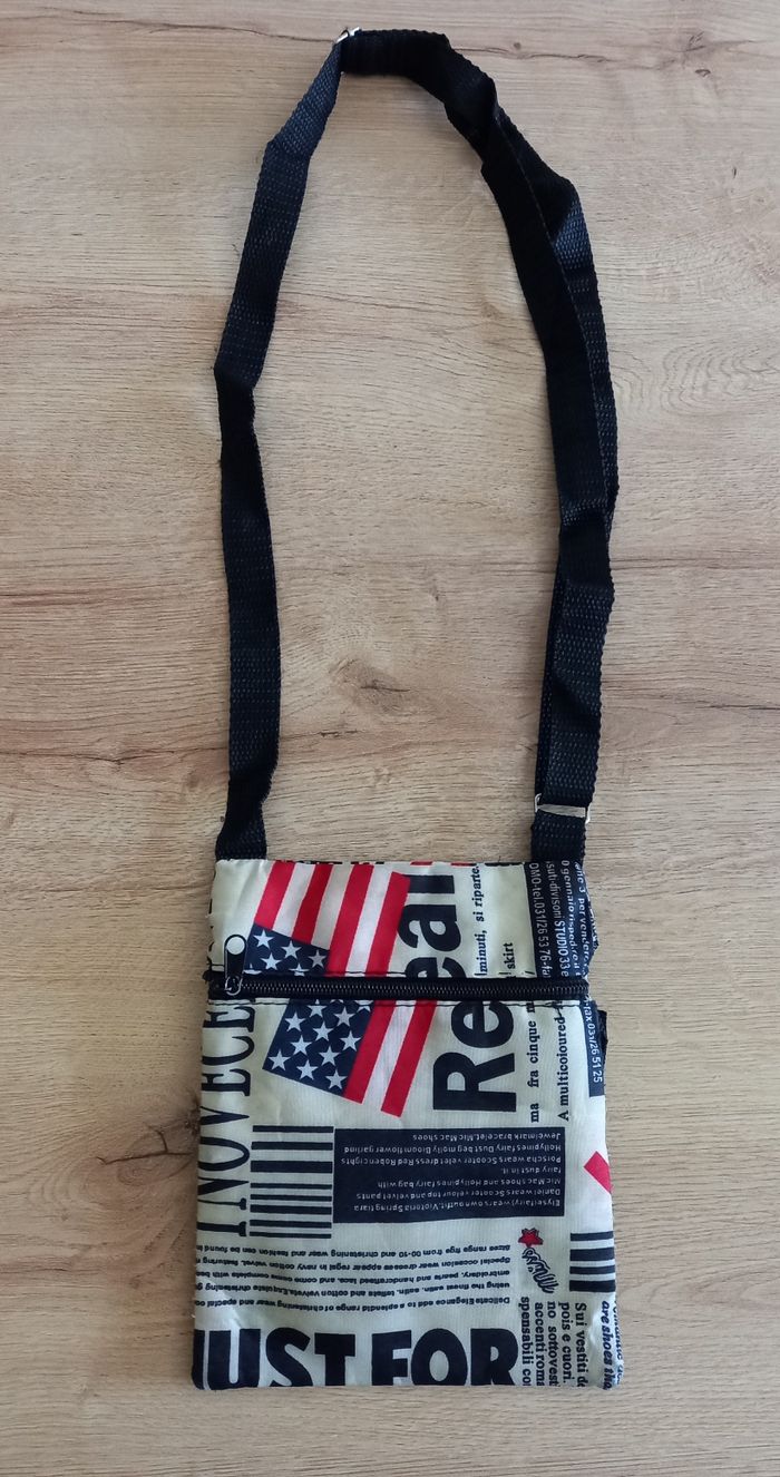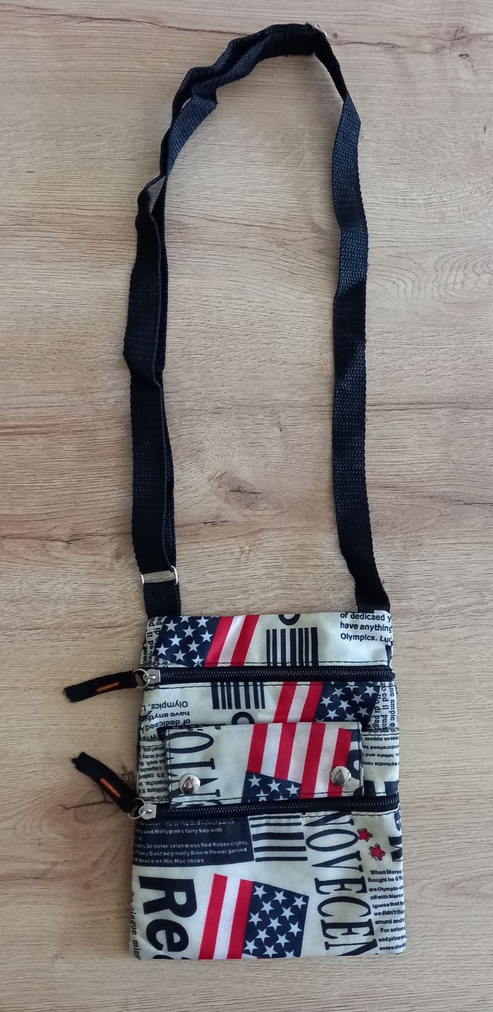 Sacoche à motif Américains, trois poches extérieures avec des fermetures éclairs et une quatrième poches avec boutons à pressions. Bandoulière réglable. Dimensions: 20 cm × 16,5 cm.