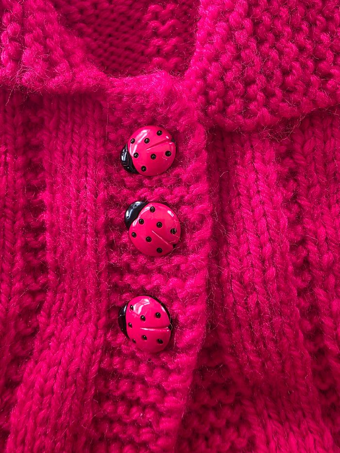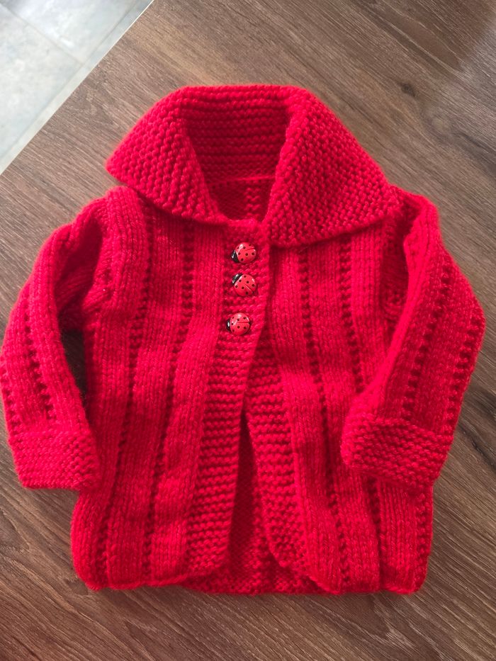 Pull laine rouge détails bouton coccinelle tricoté à la main correspond à du 6/9mois