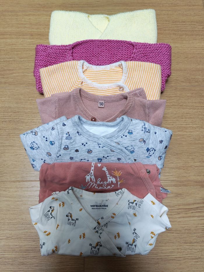 Lot naissance comportant 13 bodys manches longues, 7 brassières, 4 pyjamas manches longues, 2 leggins, 2 paires de petites chaussures bébé. Le tout en très bon état. Plusieurs marques type Kiabi, Gémo, Vertbaudet, Pat et Ripaton