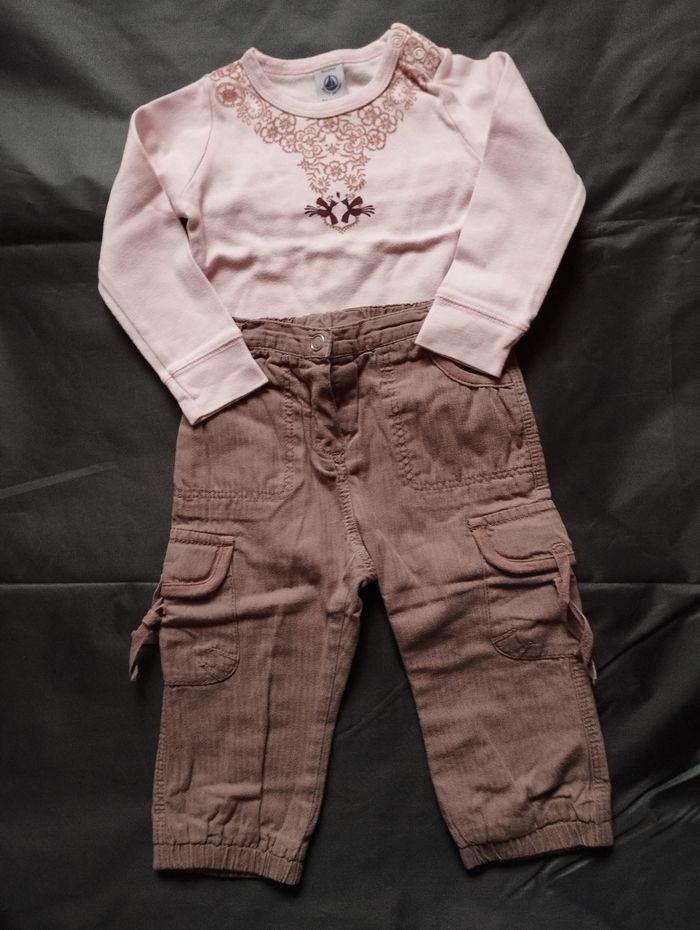 Ensemble fille : un pantalon aubergine et un t-shirt manches longues rose pâle -> Marque : Petit bateau -> Taille : 18 mois