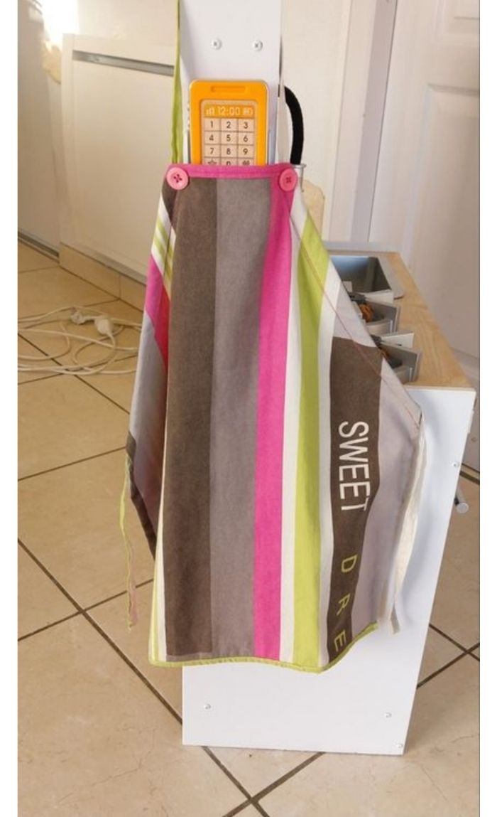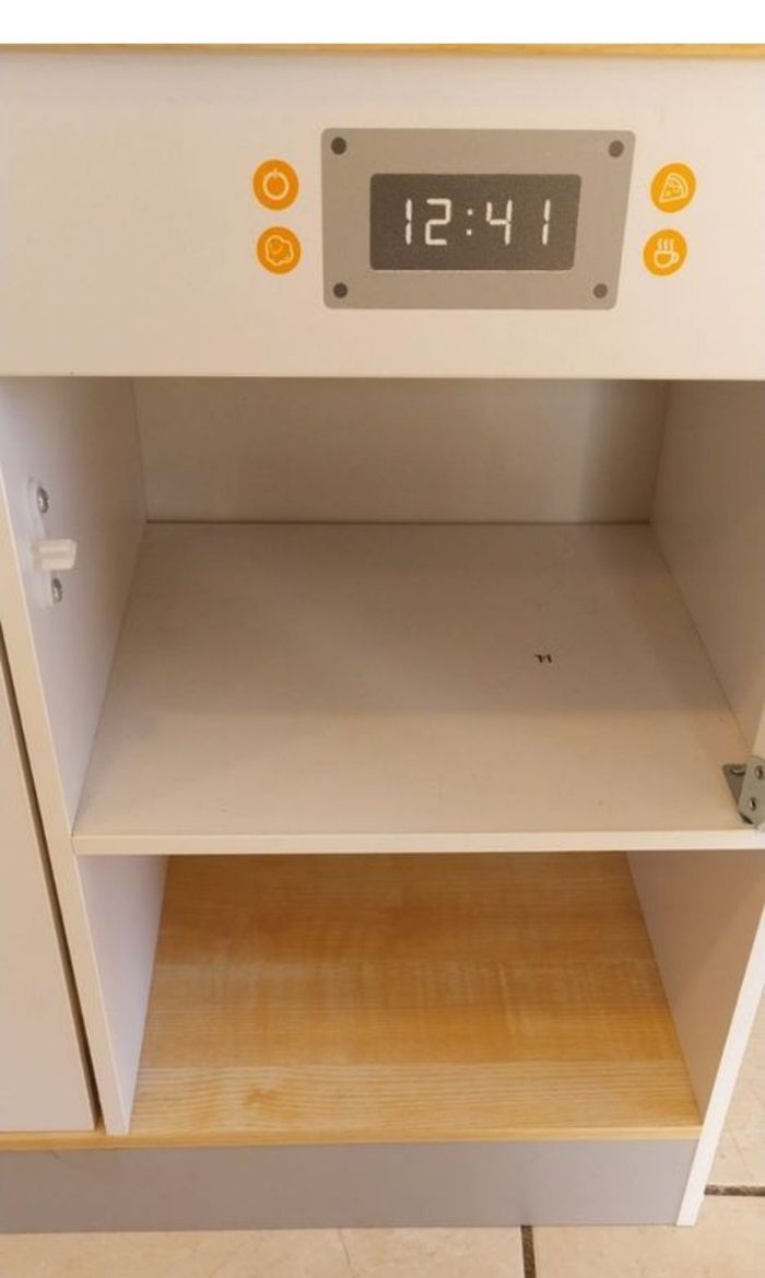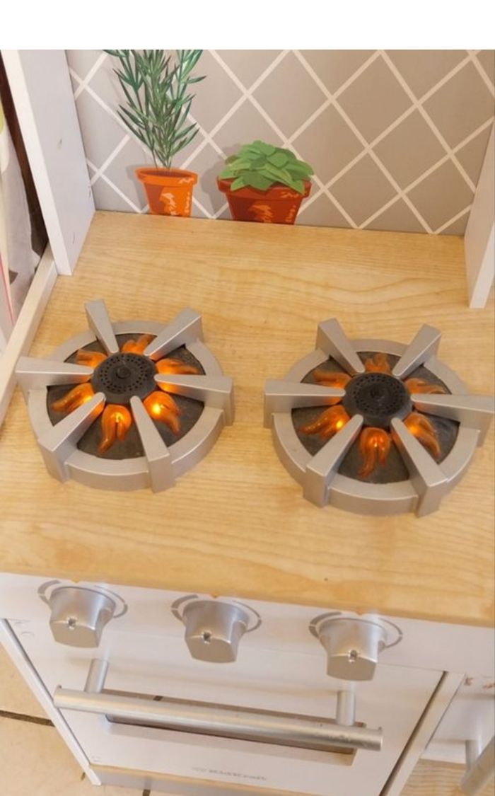 cuisine en bois marque kidkraft hauteur 89cm largeur 31cm longueur 56cm 1telephone et 1 tablier fournis avec fonctionne a piles visible sur le temple 79 1 ptit defaut a cause du chien quand il etait bb remise en main propre pas denvoit