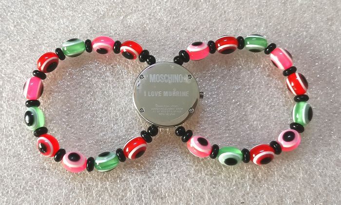 Montre MOSCHINO "I Love Murrine", effet bijou, boitier en acier argenté, intérieur blanc, aiguilles argent, et bracelet bijou à perles colorés, fonctionnante, pile fourni, prix définitif, les propositions n'auront pas de réponse.
