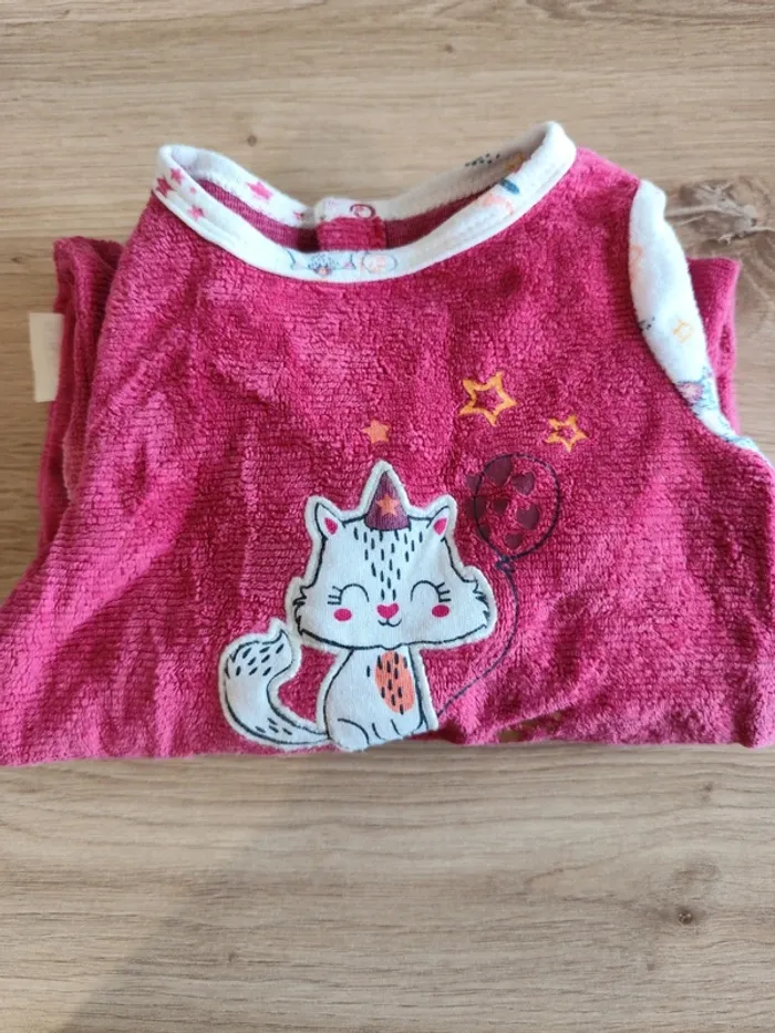 Bonjour, Je vends un pyjama manches longues avec un chat dessus, couleur rose foncé. Taille : 3 mois Marque : Petit béguin Portés quelques fois, bon état