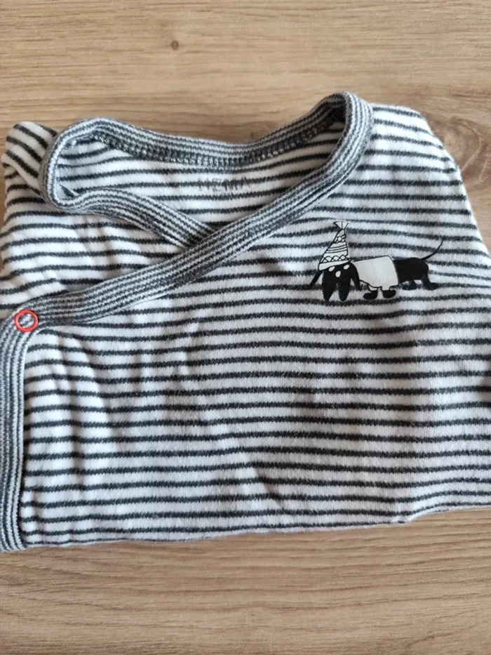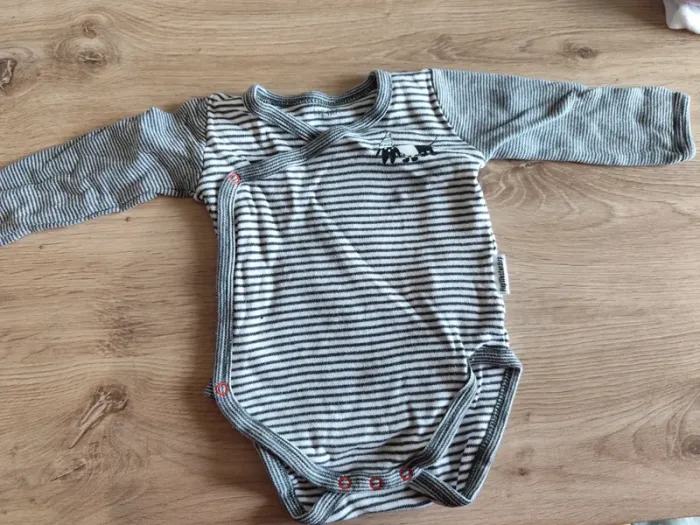 Bonjour, Je vends un bodie à rayures manches longues. Taille : 62cm Marque : Hema Portés quelques fois, bon état