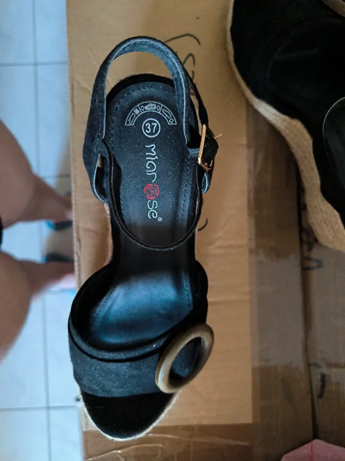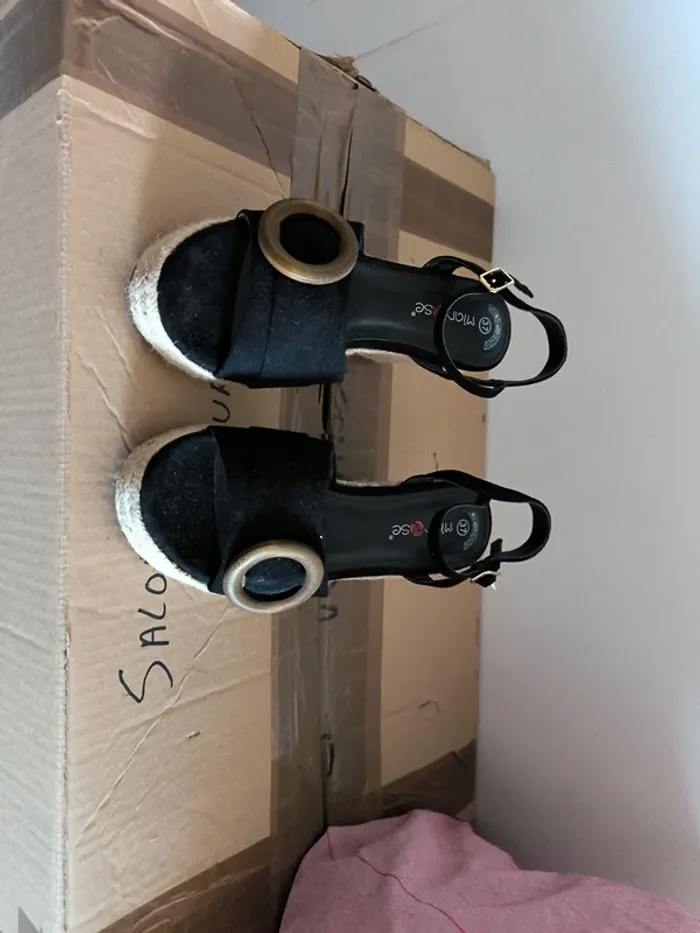Chaussures compensées noires. Portés quelques fois, ils sont en bon état. Taille : 37 Marque : Migrose (incertaine c'est écrit sur la chaussure en photo)