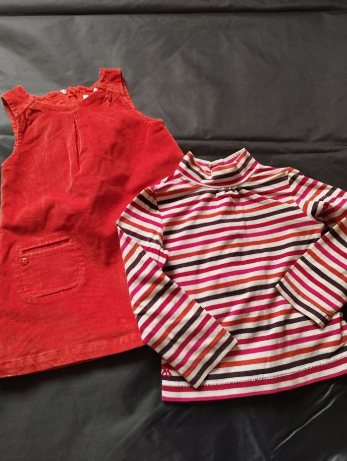 Ensemble fille : une robe doublée en velours orange + un col roulé rayé -> Marque : Obaïbi -> Taille : 18 mois