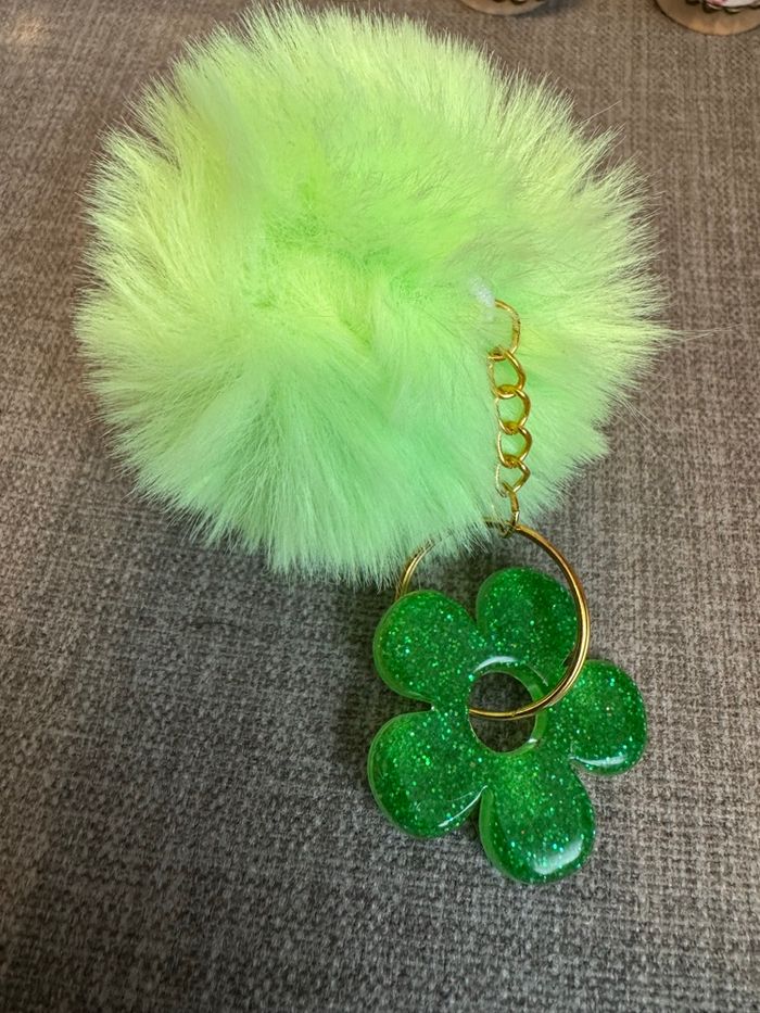 Porte clé pompom vert + breloque fleur en résine pailletée Très bon état jamais utilisé