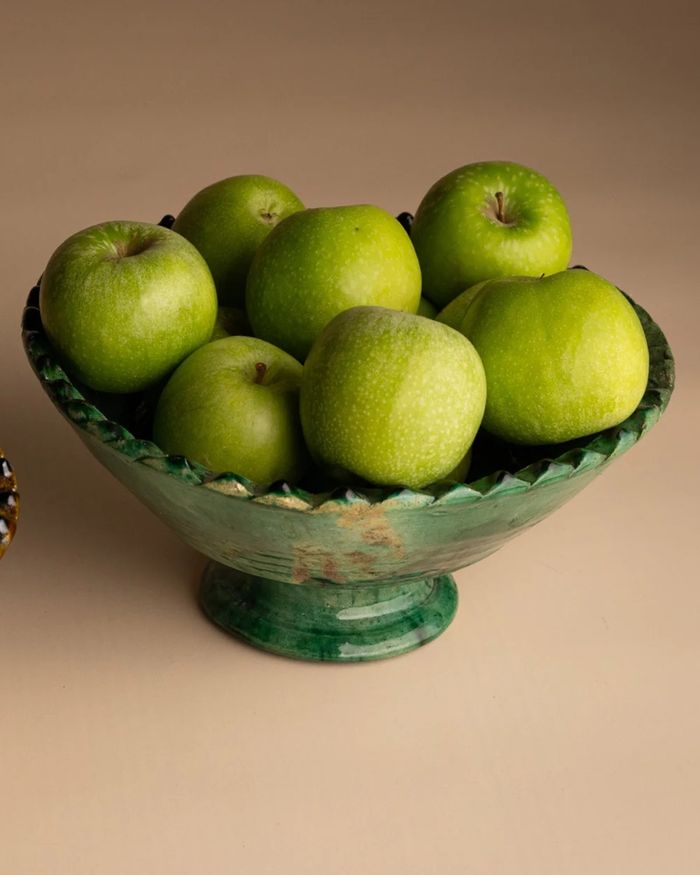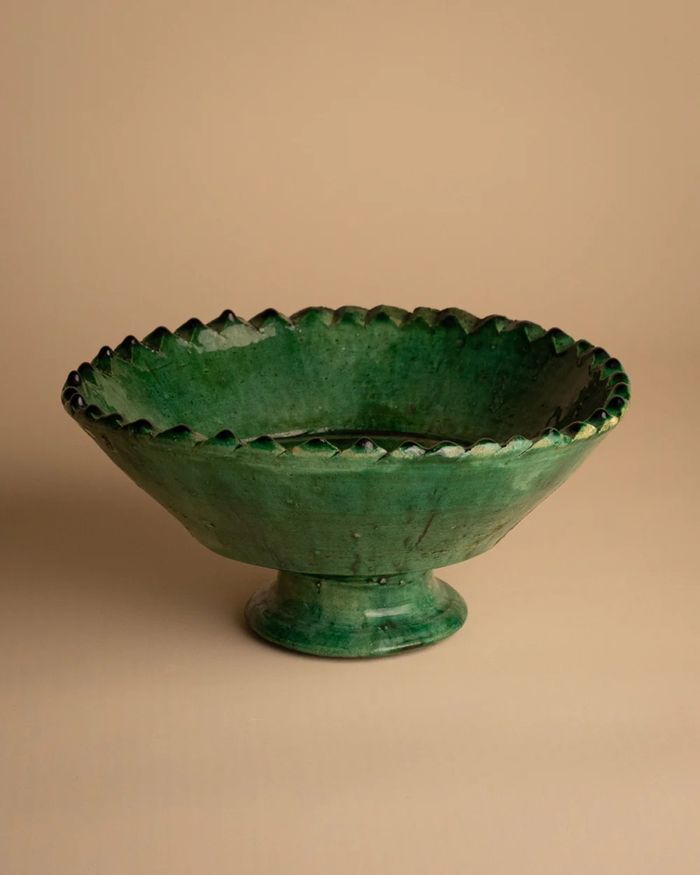 Sublimez votre intérieur avec cette coupe à fruits en céramique artisanale decouleur verte façonnée à la main dans le village de Tamegroute, au sud du Maroc. Avec ses 20 cm de diamètre, elle allie générosité des formes et élégance brute, tout en mettant à l'honneur le savoir-faire ancestral des potiers locaux. Sa finition émaillée et ses nuances naturelles apportent du caractère à votre table ou votre décoration, qu'elle soit garnie de fruits frais ou laissée vide en pièce centrale. Dimensions : env. 20cm de diamètre Conseils d'entretien : • Ne pas mettre au lave-vaisselle • Éviter l'immersion prolongée dans l'eau • Nettoyer délicatement à l'aide d'une éponge humide.