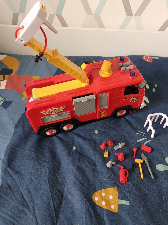 Camion "Sam Le Pompier" + accessoires. Manque le personnage Sam, la ficelle sur le devant et 1 porte ne s'ouvre plus et l'autre ferme mal (voir photo n°2).