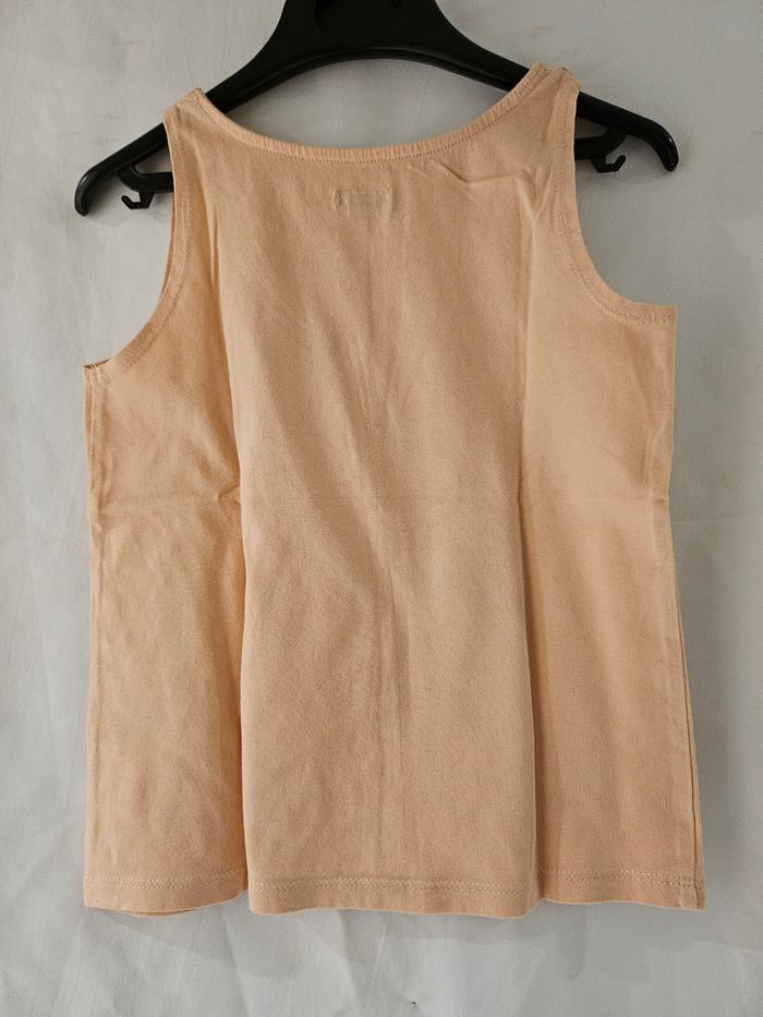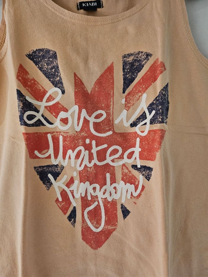 Débardeur bretelles larges orange pâle avec imprimés cœur drapeau anglais et écritures blanches. Marque : Kiabi Taille : 6 ans