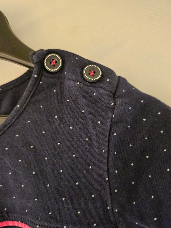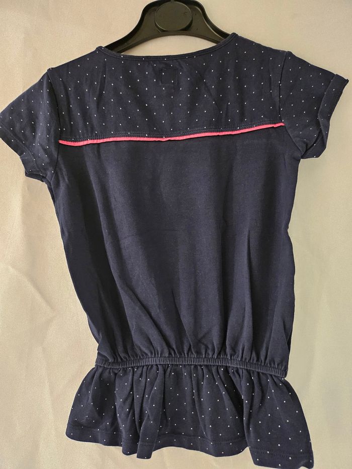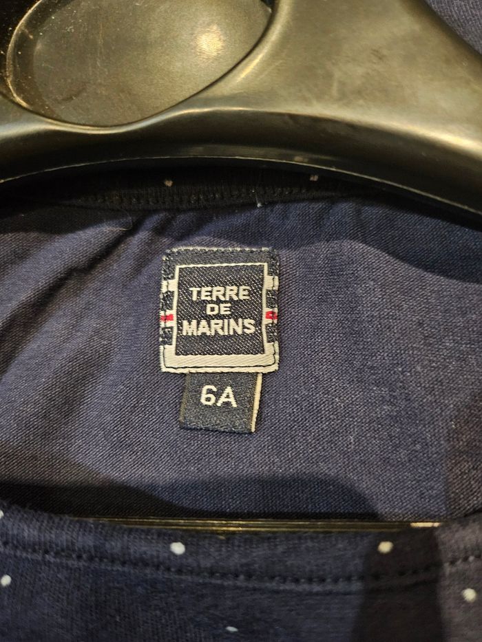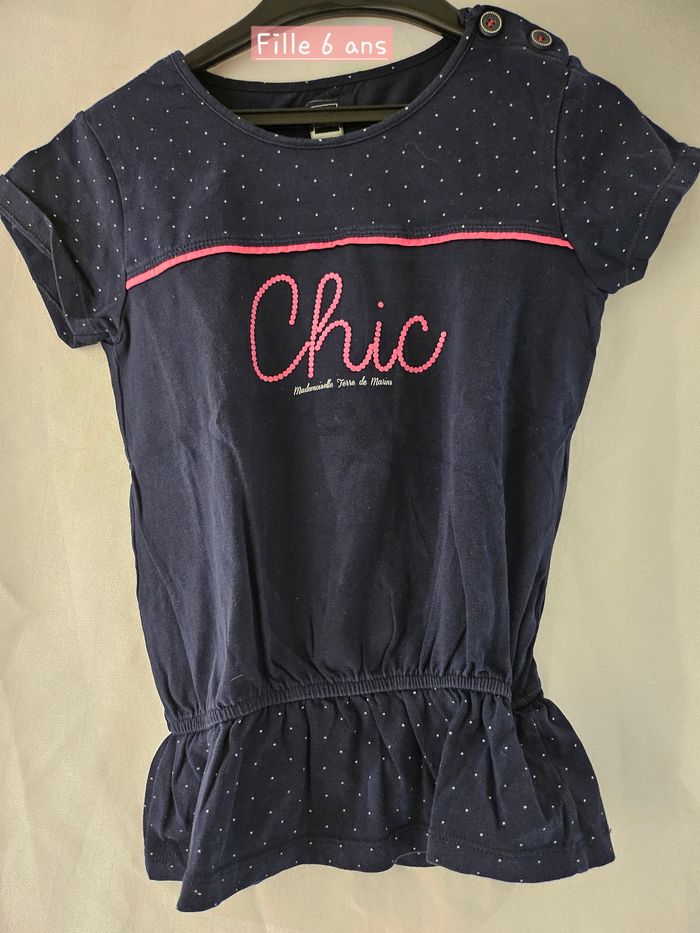 T-shirt/tunique manches courtes. Bleu à points blancs. Écriture et broderie rose. Reserré à la taille. Deux boutons sur l'épaule. Marque : Terre de marins Taille : 6 ans