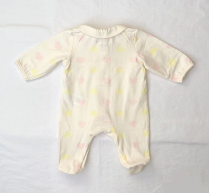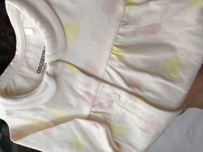 Pyjama une pièce, grenouillère, dors bien Orchestra, Taille naissance/ 50 cm, Mi-saison, été, En coton/ élasthanne. De couleur crème, motifs cœurs jaunes et rose clair, Très élégant avec son col Claudine, Resserré au bout des manches, Pressions sur l’avant estampillées avec un cœur. Ouverture intégrale, par pressions, sur tout l’avant et entre les jambes Neuf, lavé mais jamais porté. Collection actuelle, encore disponible sur le site Orchestra. 🌸 N’hésitez pas à regarder mes autres annonces, j’ai beaucoup de choix.