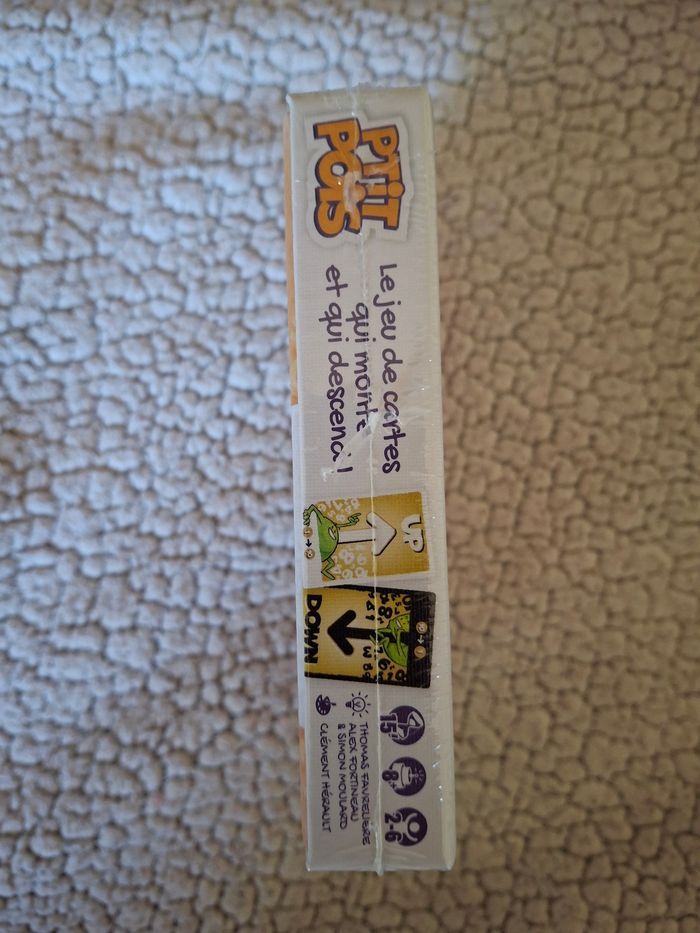 Ptit pois neuf sous scellé A partir de 8 ans Pour 2 à 6 joueurs Durée d’une partie minutes : moins de 30 minutes Le jeu de cartes qui monte et qui descend ! A votre tour de jeu, jouez vos cartes sur l’une des 2 piles de défausse en respectant l’ordre imposé par la carte Up&Down : soit monter en valeur, soit descendre. N’hésitez pas à modifier cet ordre pour prendre l’avantage et ralentir vos adversaires ! Anticipez vos actions pour vous débarrasser au bon moment des cartes que vous possédez dans votre main ou devant vous (dont certaines sont cachées au début) pour mettre fin à la manche et marquer le moins de points possible ! Après 3 manches, le joueur qui cumule le plus petit score remporte la partie. Préparez-vous à devenir accro à Ptit Pois, tellement il est malin et rapide ! Prévu pour 2 à 6 joueurs, il brille en plus dans toutes les configurations.