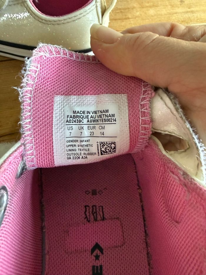 Converse paillettes blanches olographiques et intérieur rose. Quelques petites traces d’utilisation mais reste encore en bon état. Pointure 23.