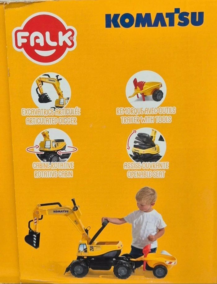 ​Bonjour Je vends porteur pelleteuse de la marque Falk, modèle sous licence officielle Komatsu. Idéal pour jouer à l'extérieur ou à l'intérieur. ​Caractéristiques principales : ​Âge recommandé : Dès 3 ans. ​Fonctions : * Cabine rotative à 360°. ​Bras articulé entièrement fonctionnel avec godet. ​Assise ouvrante (petit coffre de rangement sous le siège). ​Remorque amovible incluse. ​Accessoires : Livré avec une petite pelle, un râteau et un casque de chantier inclus. ​Fabrication : Made in France 🇫🇷. ​Dimensions (approximatives) : Longueur totale avec remorque de 125 cm. Supporte jusqu'à 50 kg.
