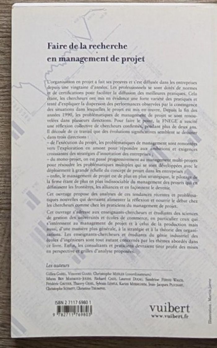 bonjour vends ce livre "faire de la recherche en management de projet", Gilles Garel, Vincent Giard, Christophe Midler idéal pour étudiant en Gestion de projet, formateur ou chef de projet ISBN : 978-2711769803 État neuf prix 10€ (envoi rapide et soigné) Depuis la fin des années 1990, les problématiques de management de projet se sont renouvelées dans plusieurs directions. Pour faire le point, la FNEGE a suscité une réflexion collective de chercheurs confirmés, pendant plus de deux ans. Cet ouvrage s'adresse aux enseignants-chercheurs et étudiants des sciences de gestion des universités et écoles de commerce, en particulier ceux qui s'intéressent au management de projet et à celui de la production mais aussi, d'une manière plus générale, à la stratégie et à la théorie des organisations. Les enseignants-chercheurs et étudiants du génie industriel des écoles d'ingénieurs sont tout autant concernés par les thèmes abordés dans ce livre. Enfin, les consultants et praticiens devraient tirer profit des mises en perspective et grilles d'analyse proposées.