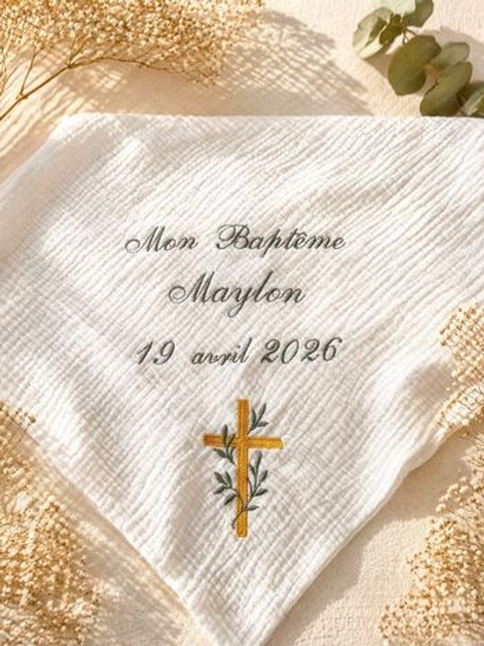 Châle baptême Double gaze de coton Mon baptême + prénom + date + motif (croix ou colombe)