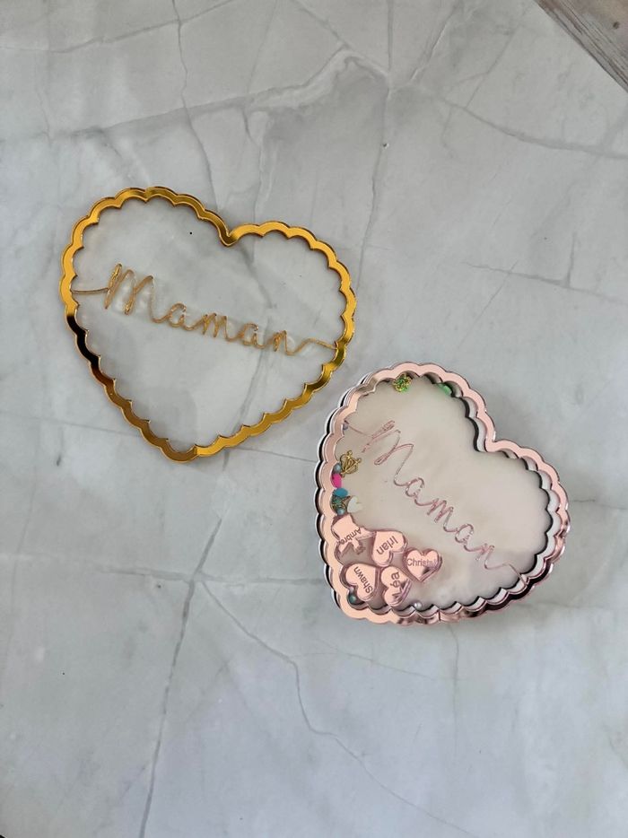 Magnet aimente pour fete des meres Or ou rose ou argenté Possibiliter de mettre plusieur prenom a interieur egalement de changer mot maman par prenom ou autre Fais en plexy et bois