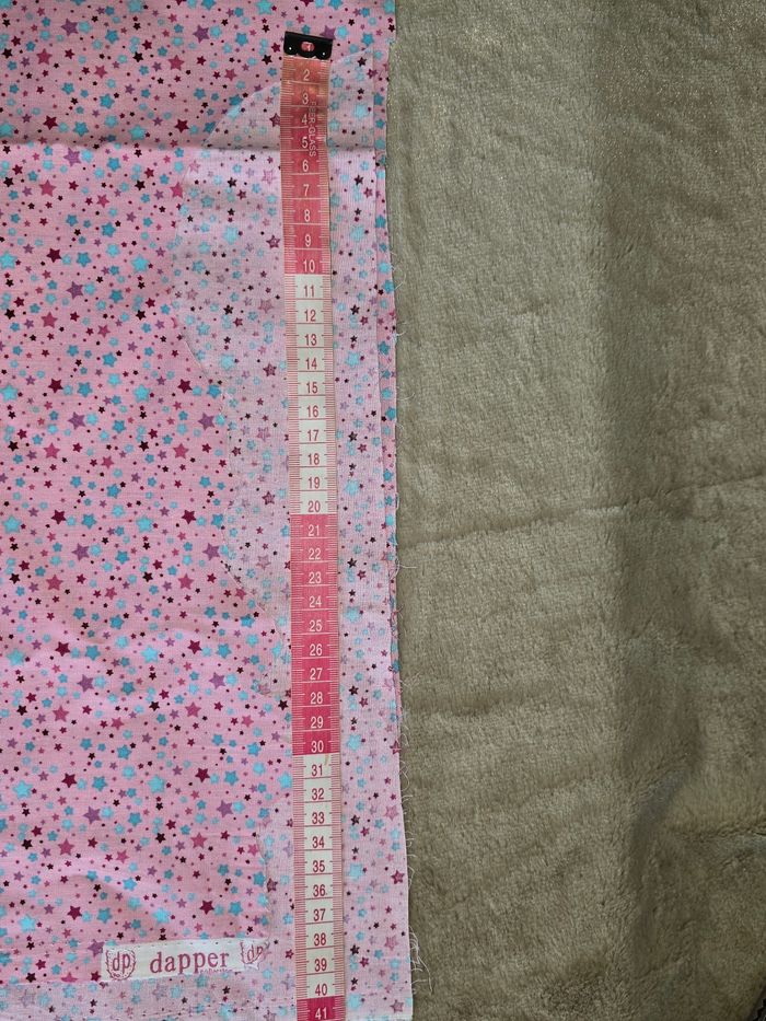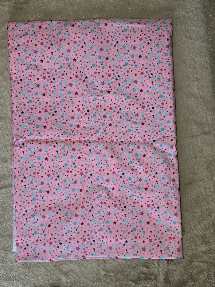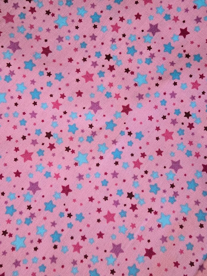 100x144cm Coton non élastique rose avec etoiles multicolores Attention manque un petit bout d'environ 37x8cm, voir dernière photo