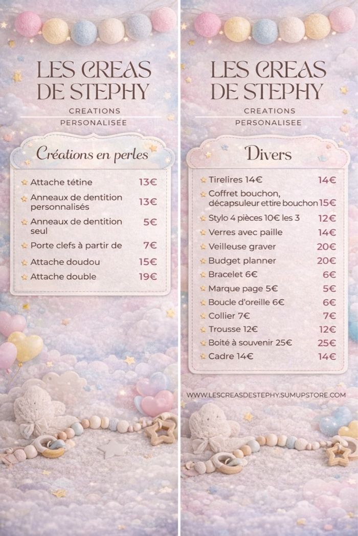🎁 Coffret de naissance personnalisé 🎁 Offrez (ou offrez-vous 🤍) un coffret de naissance unique, entièrement personnalisé et fait avec amour ✨ 🧸 Chaque coffret est composé selon vos envies : Choisissez librement les articles parmi le tableau des tarifs en photo (doudou, bavoir, attache tétine, couverture, accessoires, etc.) pour créer un cadeau vraiment unique 💫 💡 Comment ça fonctionne ? 1. Vous sélectionnez vos articles préférés 2. Vous choisissez les prénoms / couleurs / thèmes 3. Je crée votre coffret sur-mesure avec soin 🎀 🌈 Possibilité de : * Coffret fille, garçon ou mixte * Thème doux et tendance (couleurs pastel, beige, etc.) * Personnalisation avec prénom 🎁 Idéal pour : * Naissance * Baby shower * Cadeau original et personnalisé 💖 Créations artisanales réalisées avec douceur et attention 📩 N’hésitez pas à me contacter pour composer votre coffret ou pour toute demande spéciale