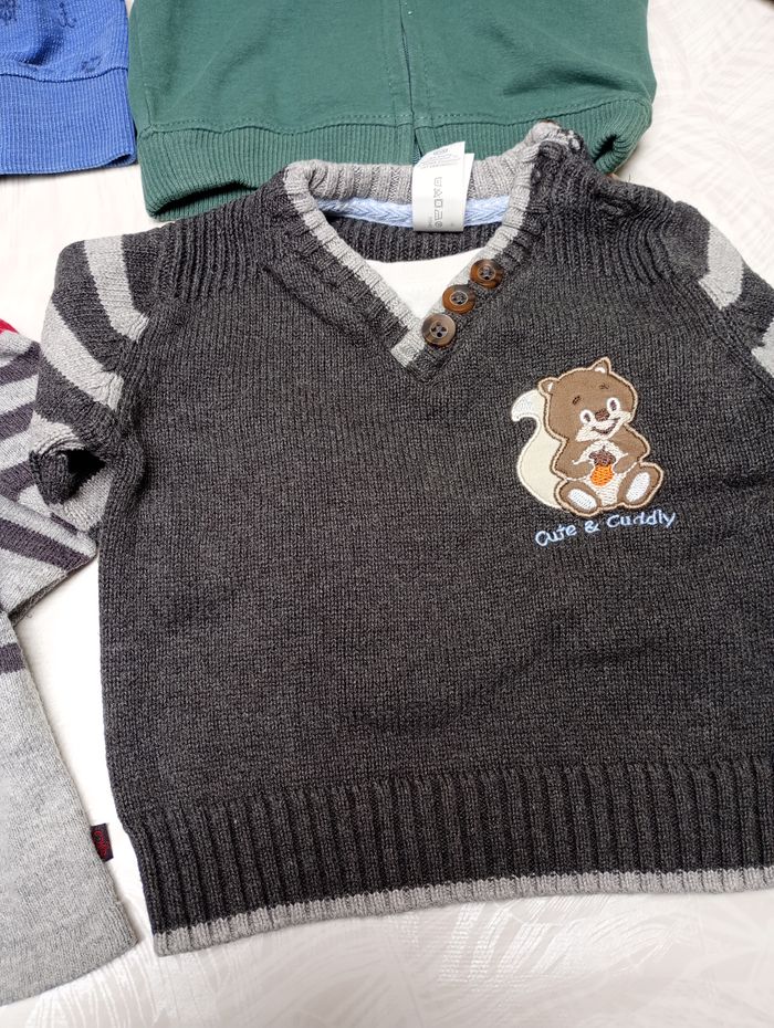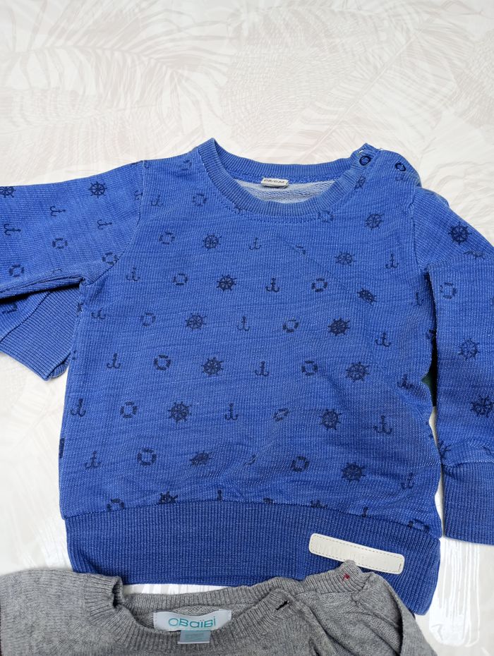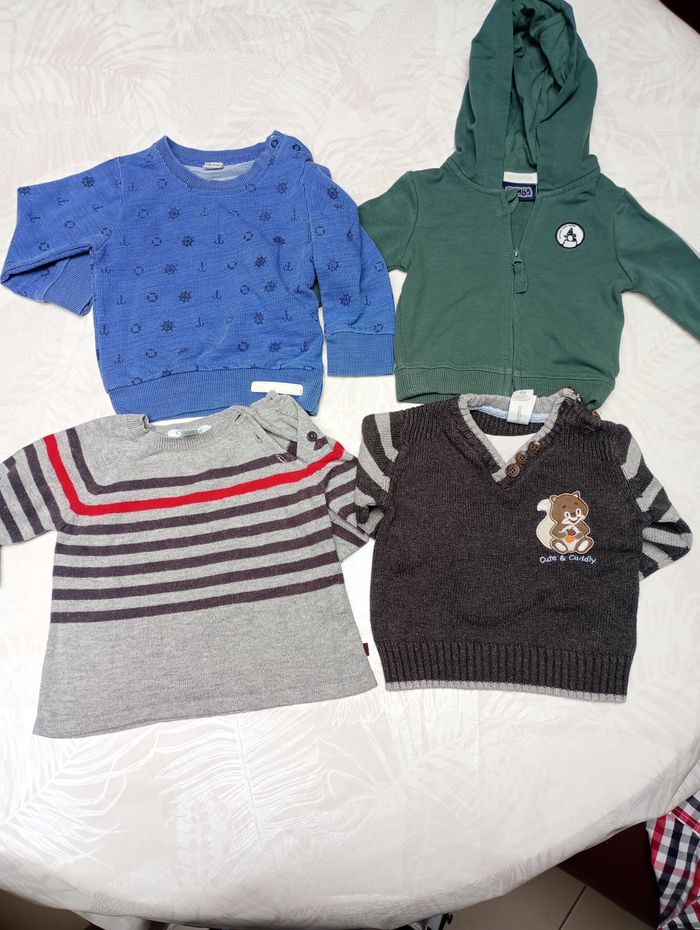 Lot de 3 pulls et 1 gilet à capuche pour bébé garçon. Tout est en très bon état. Marques : Bumba, Obaïbi, C&A et Zeeman.