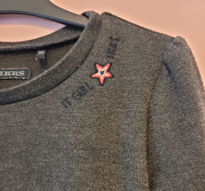 Pull court, de couleur gris foncé, avec inscription sur col, de la marque Ikks, taille 6 ans (114 cm), en très bon état. Article lavé pour la vente.