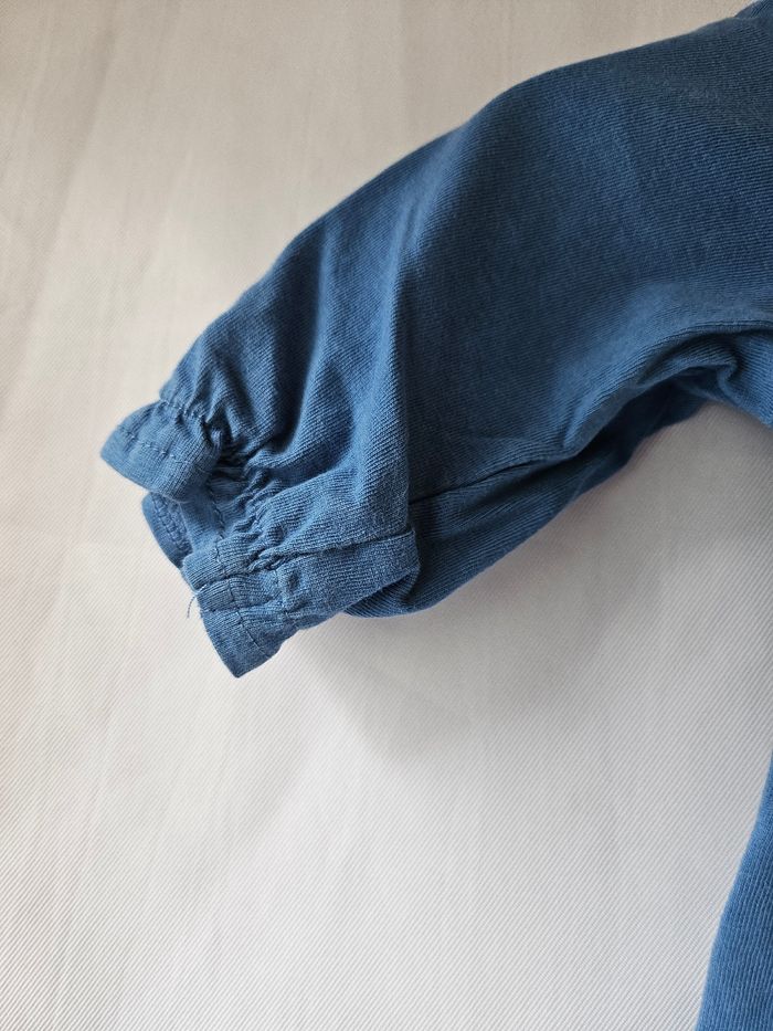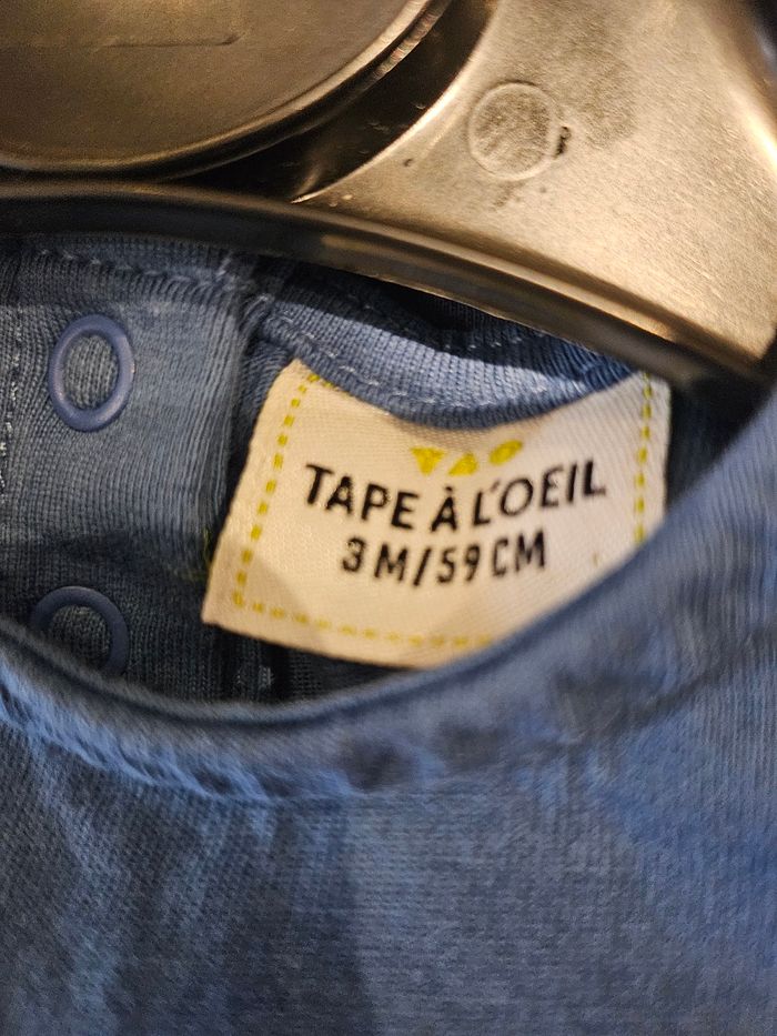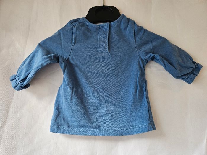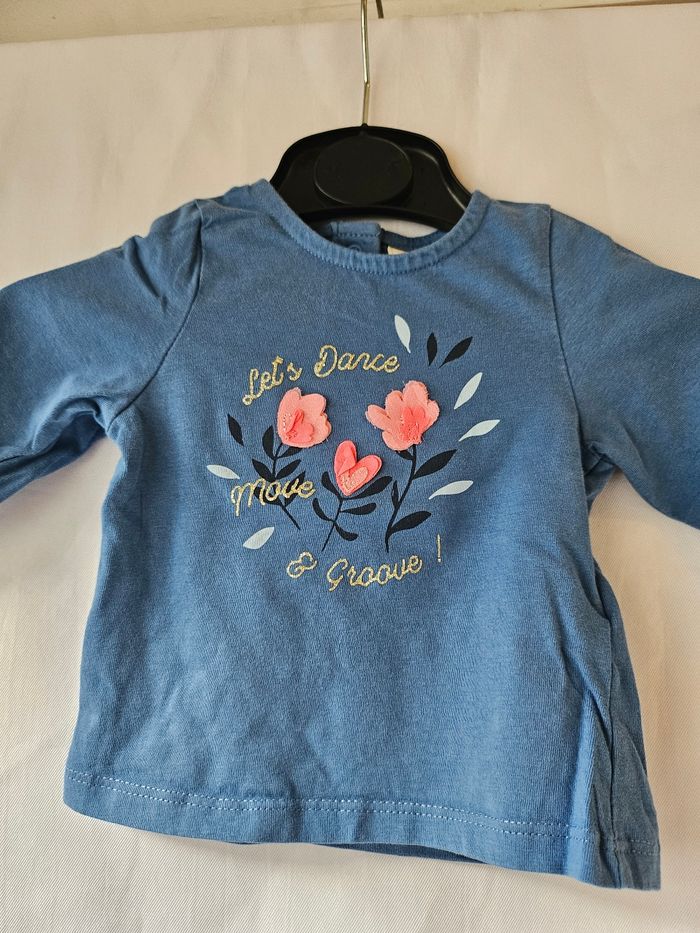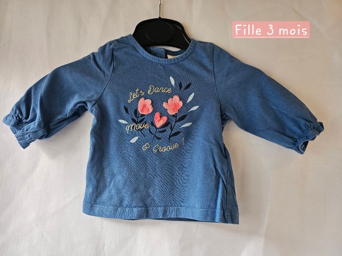 T-shirt manches longues bleu avec imprimés devant. Fleurs rose légèrement en relief. Trois pressions dans le dos. Marque : Tape à l'œil Taille : 3 mois
