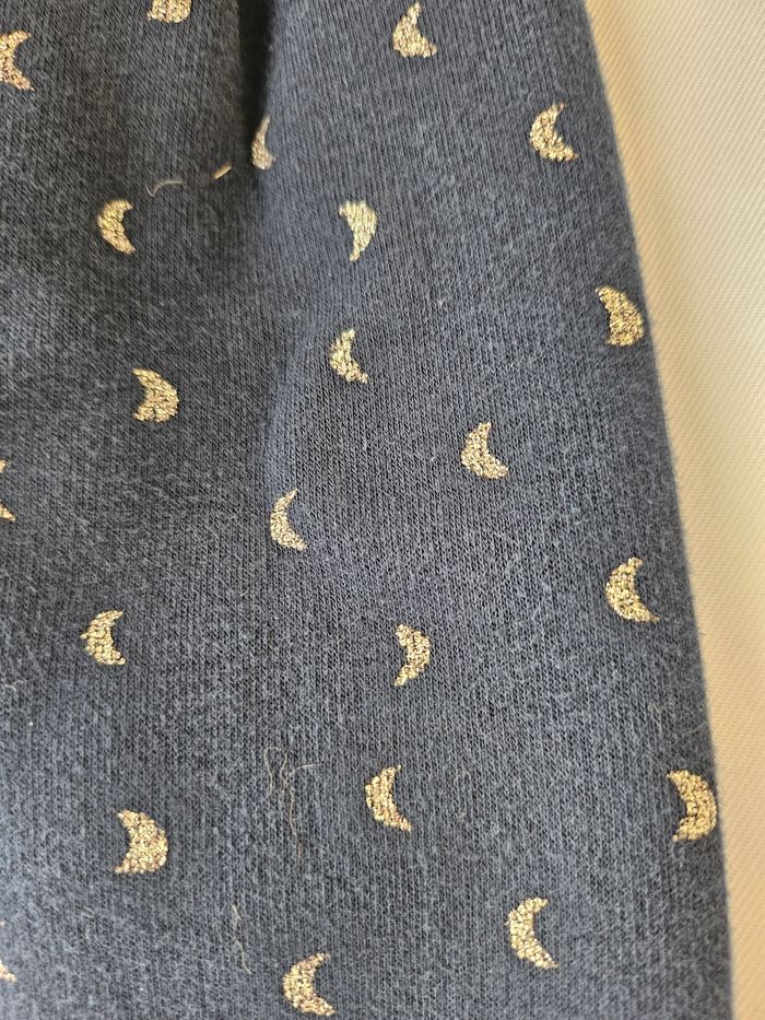 Jogging bleu foncé avec imprimés demi-lunes brillantes. Noeud décoratif à la taille. Marque : Kiabi Taille: 3 mois