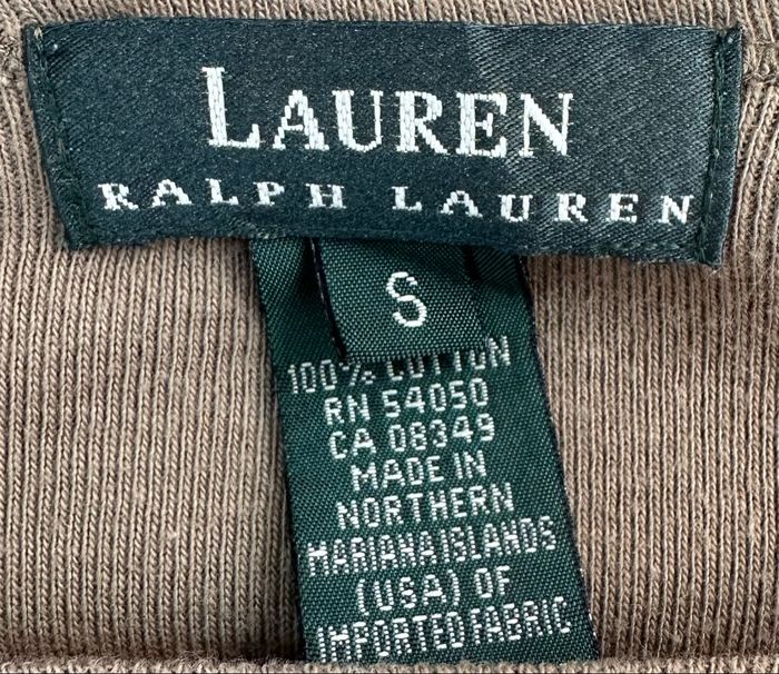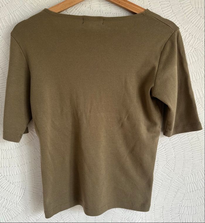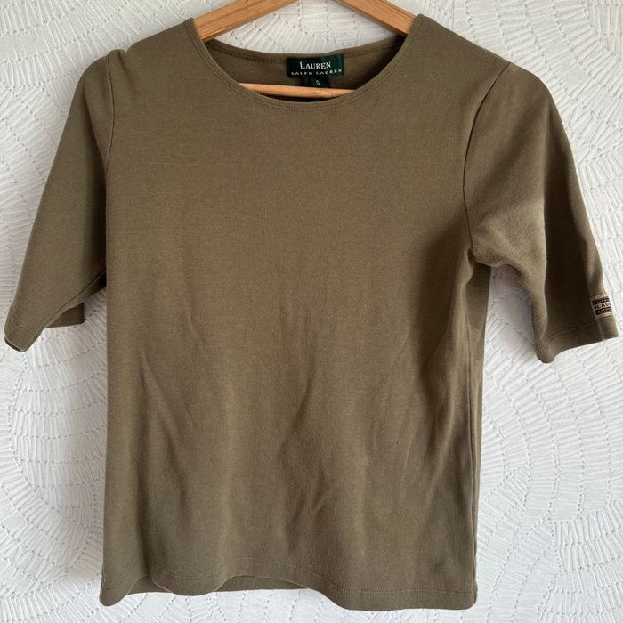 Ce t-shirt vert olive de Lauren Ralph Lauren, taille S, est un basique intemporel avec une coupe classique et des manches trois quarts. Sa couleur polyvalente et sa simplicité en font une pièce facile à assortir pour un look casual chic.