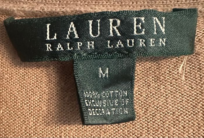 C'est un cardigan Lauren Ralph Lauren, taille M, à col en V, boutonné, avec deux poches devant et le logo brodé.