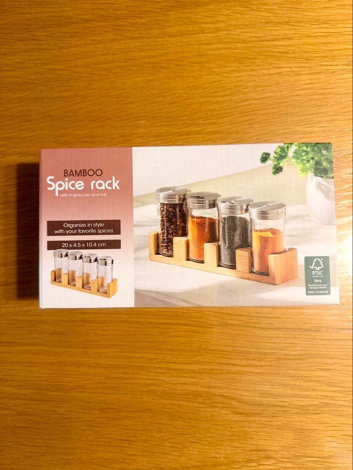✨Présentoir à épices neuf support bambou, pots en verre et inox. ✅ Neuf 🛍 D’autres articles sont disponibles dans mon dressing 🤩 la réduction sur les lots est activée 💶 N’hésitez pas à regarder 👀 pour limiter les frais d’envoi 📦
