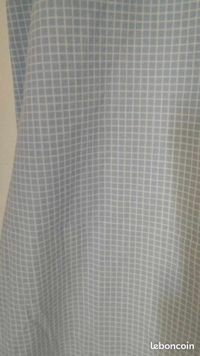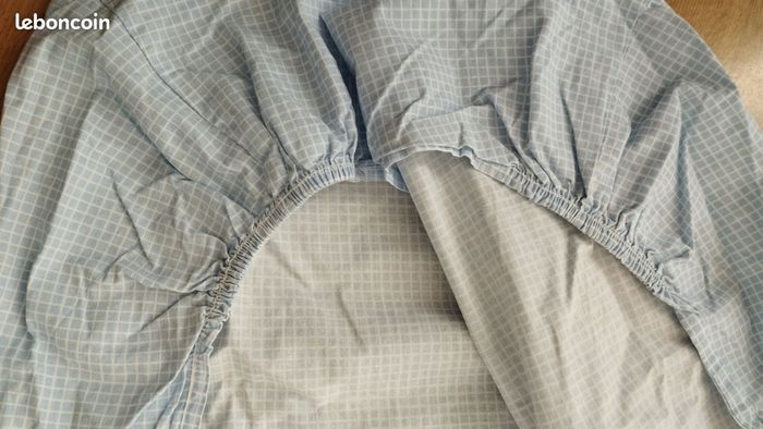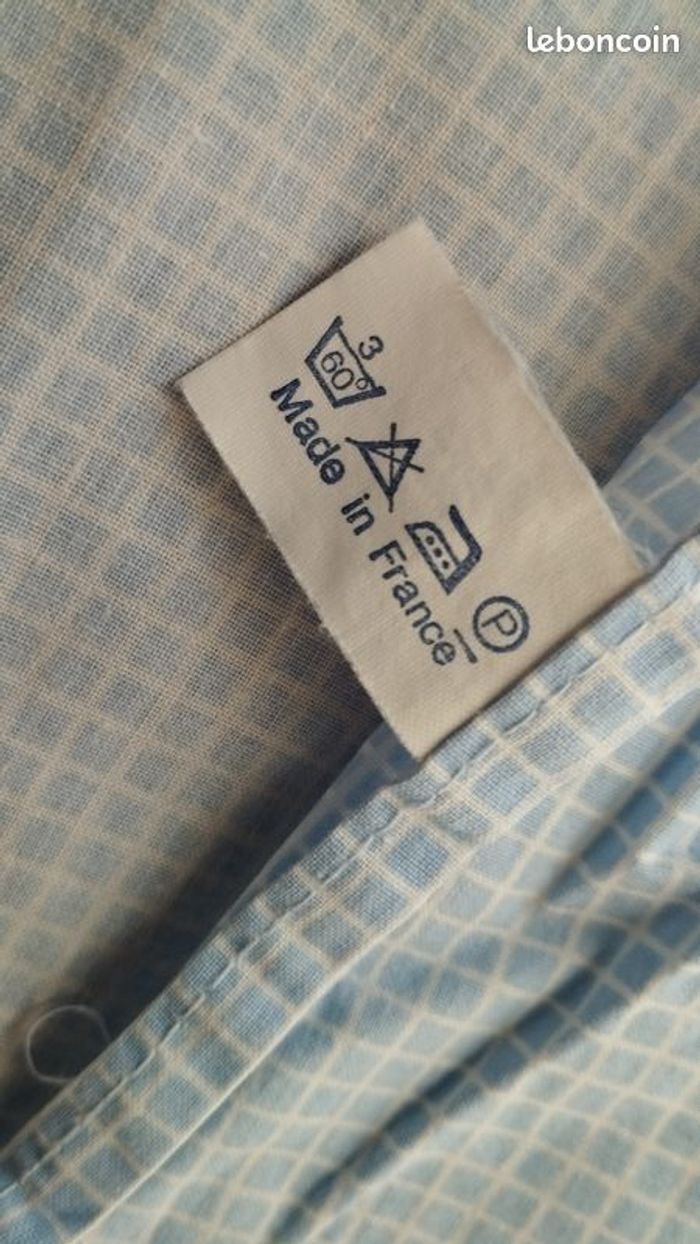 Drap housse de chez Jacadi, pour lit bébé, enfant, en vichy bleu ciel et blanc. 110 sur 60 largeur hauteur 15cm. Très bon état. J'ai mis aussi en vente séparée la housse de couette !