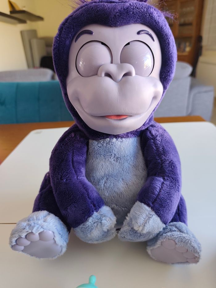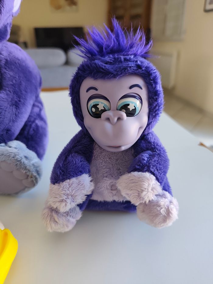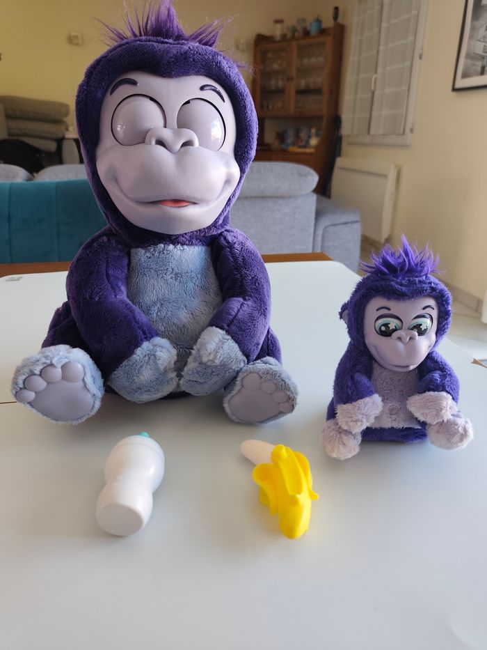Peluche tiki & toko Pile à changer Peluche interactive à s'occuper, nourrir et bercer Accessoires inclus banane et biberon Effets sonores Fonctionnent avec 3 piles LR03 et 4 piles LR14 Des 4 ans