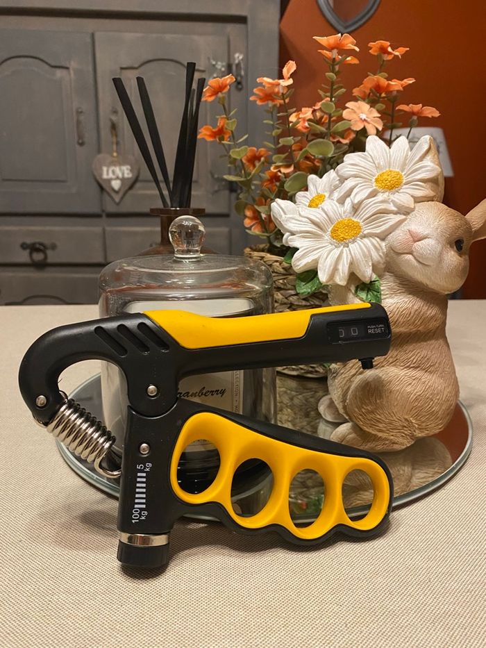 ✅ 💯 % neuf 🌸 Il s'agit d'un hand grip ajustable, un accessoire de musculation conçu pour renforcer la force de préhension des mains et des avant-bras. Résistance réglable : Permet d'adapter la difficulté de l'exercice entre 5 kg et 100 kg Compteur intelligent : Intègre un écran pour compter automatiquement le nombre de répétitions effectuées. Usage polyvalent : Idéal pour la musculation, le sport (tennis, escalade) ou la rééducation.